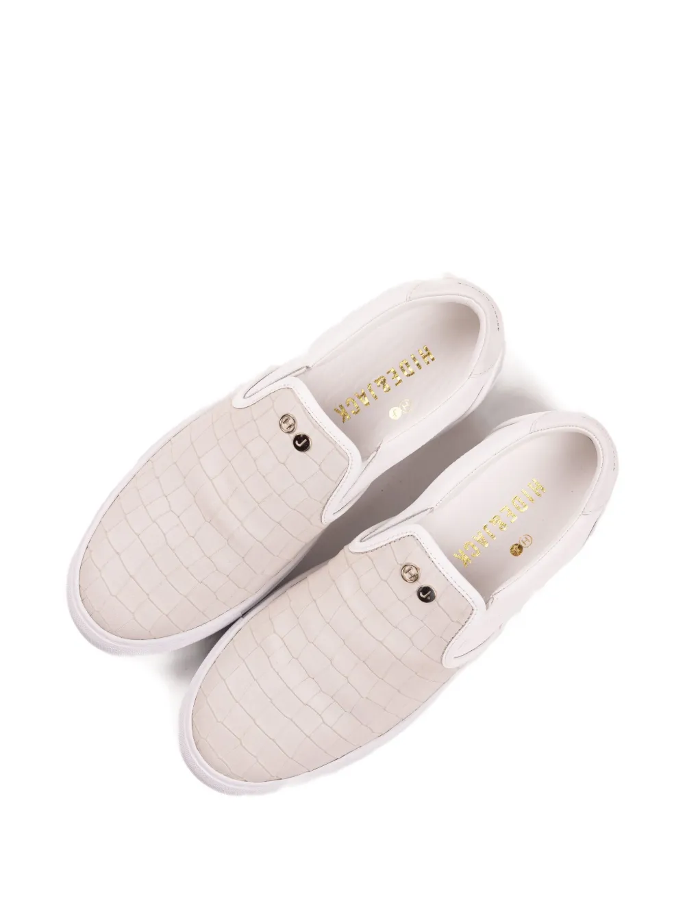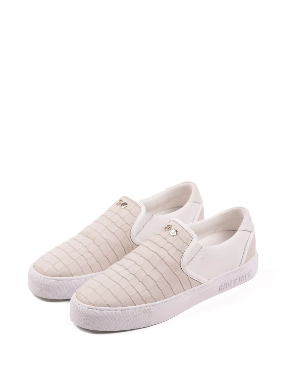 Белый цвет, тисненый дизайн, круглый носок, модель без застежек, с логотипом, плоская подошва