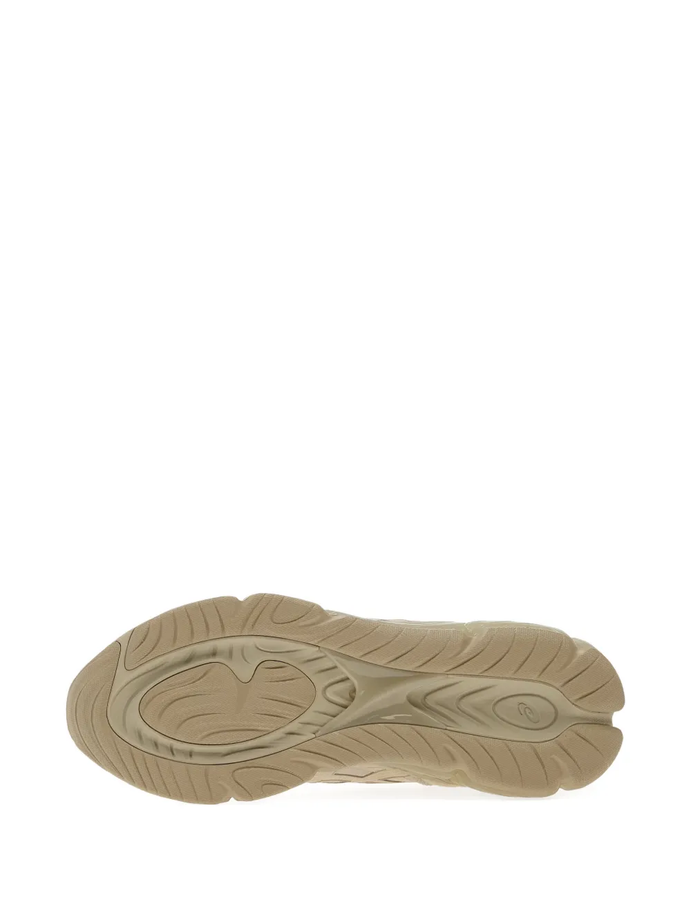 Бежевый цвет, логотип, шнуровка, петля на пятке, резиновая подошва, текстурированные детали
