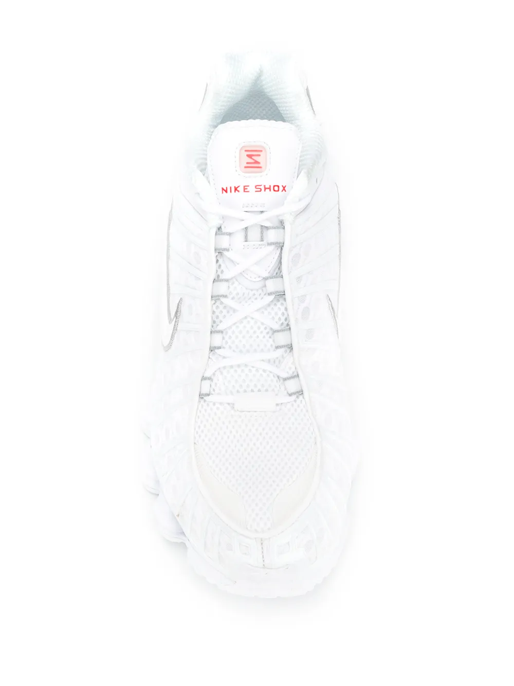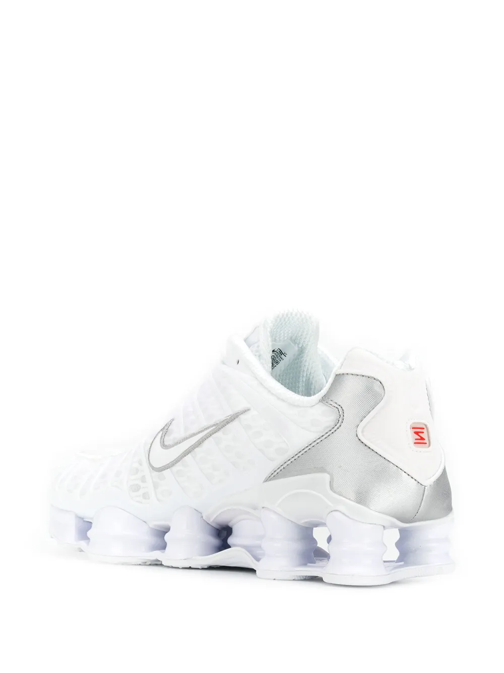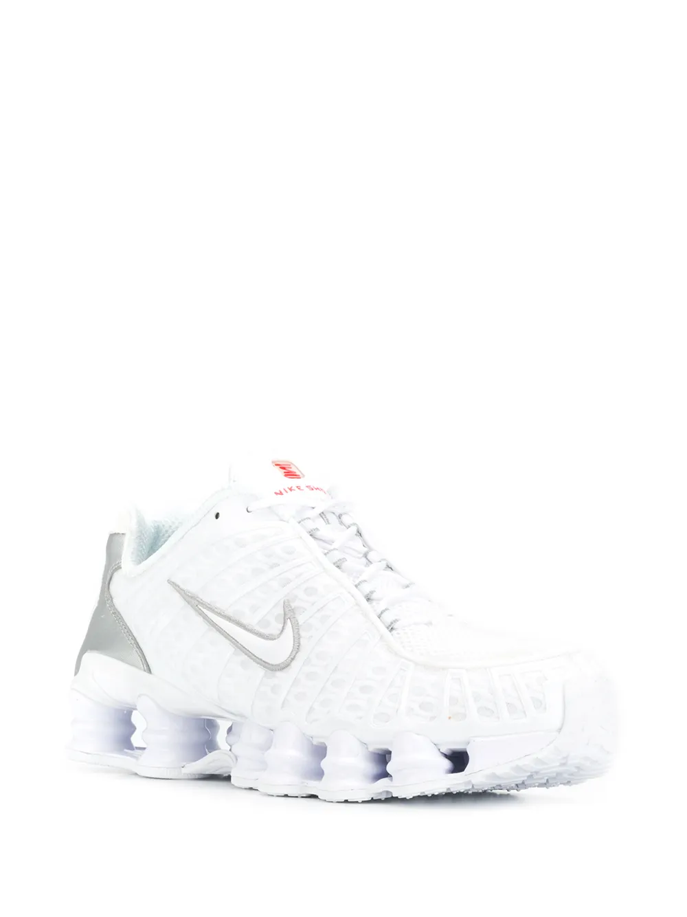 Кроссовки Nike Shox TL от Nike (Найки). Закругленный носок, панели из сетки, шнуровка спереди, заплатка с логотипом на язычке, уплотненная щиколотка и фирменный дизайн каблука. Цвет: белый.