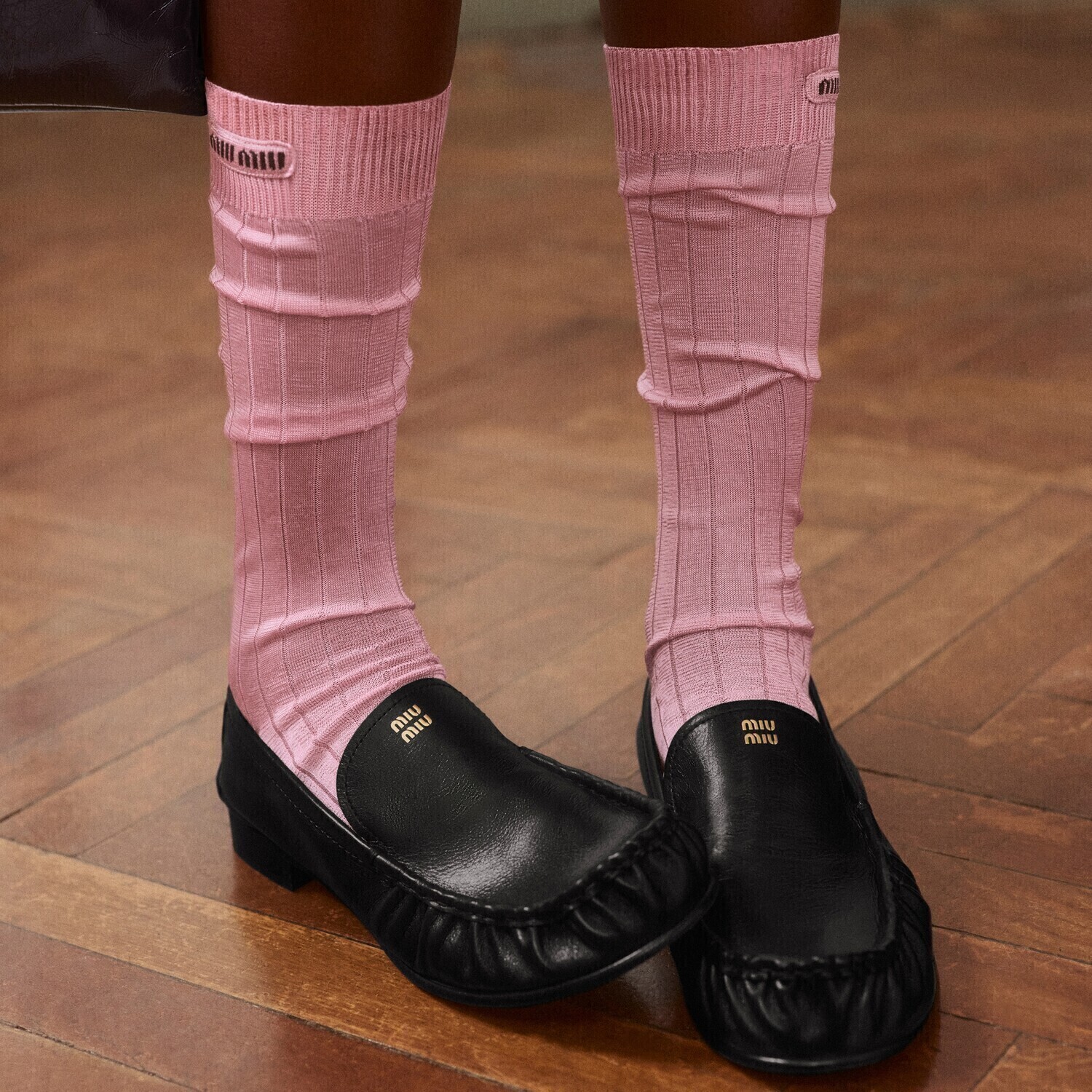 Винтажная эстетика Miu Miu проявляется в рубчатой текстуре этих шелковых носков, переосмысленных в современном ключе благодаря игривой, узнаваемой нашивке с логотипом.
