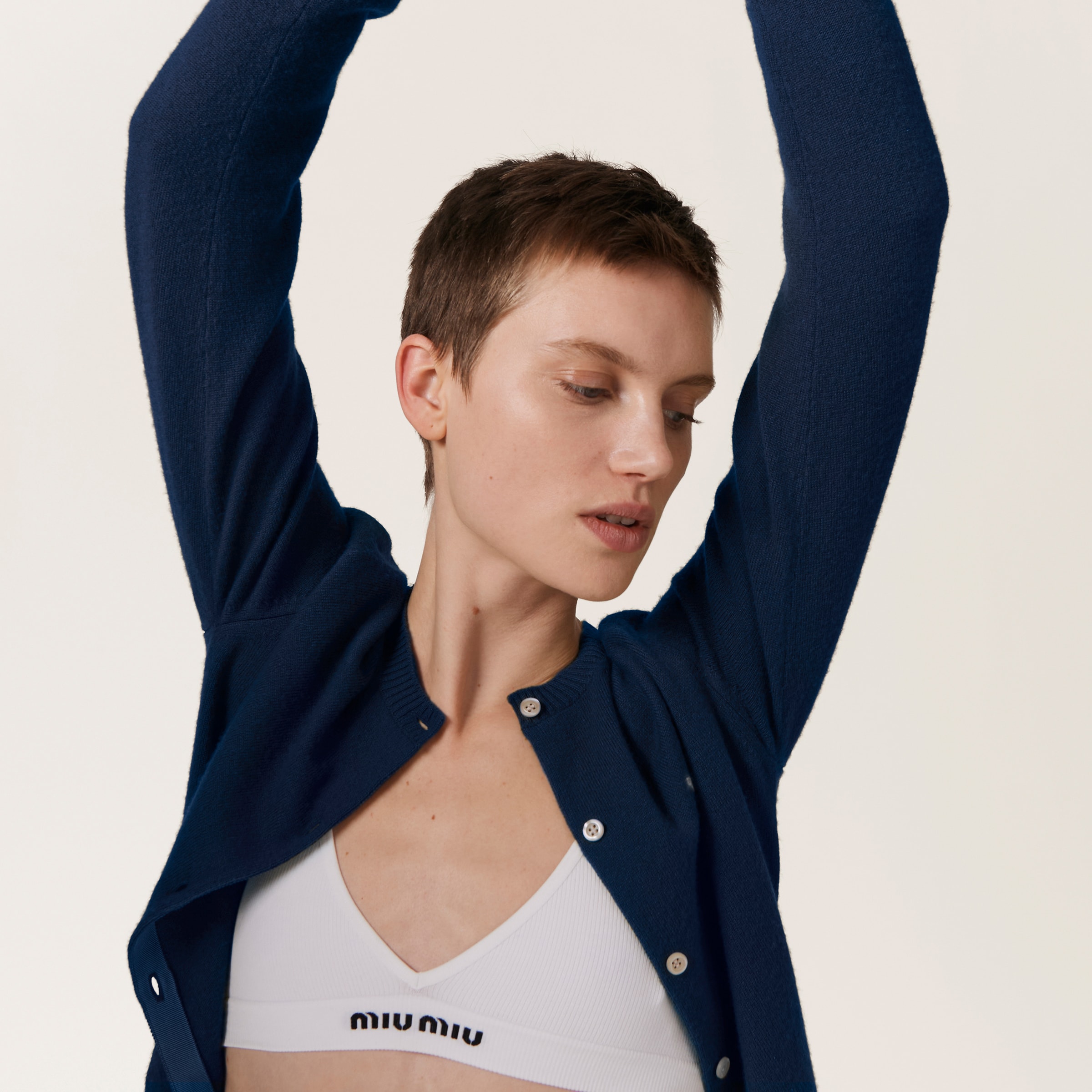 Логотип Miu Miu выделяется на эластичной ленте этого бюстгальтера благодаря контрасту цветов и своему культовому стилю. Минималистичные линии и простая строчка сочетаются, создавая универсальный предмет одежды.