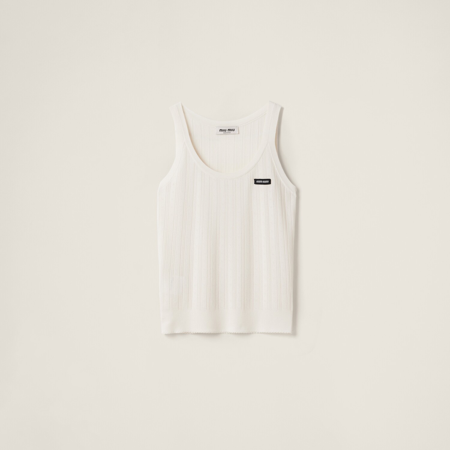 Ажурная вязка этого топа напоминает классическое винтажное белье. Легкость кашемира и шелка в сочетании с логотипной нашивкой придают ему стильный и современный характер.