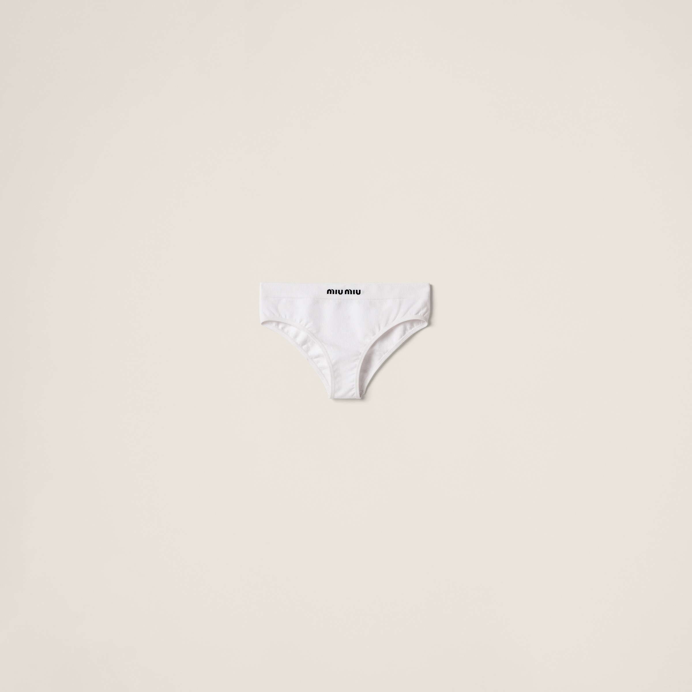 Логотип Miu Miu выделяется на эластичном поясе трусиков благодаря цветовому контрасту и своему культовому характеру. Минималистичные линии и простая строчка подчеркивают универсальность этой модели.