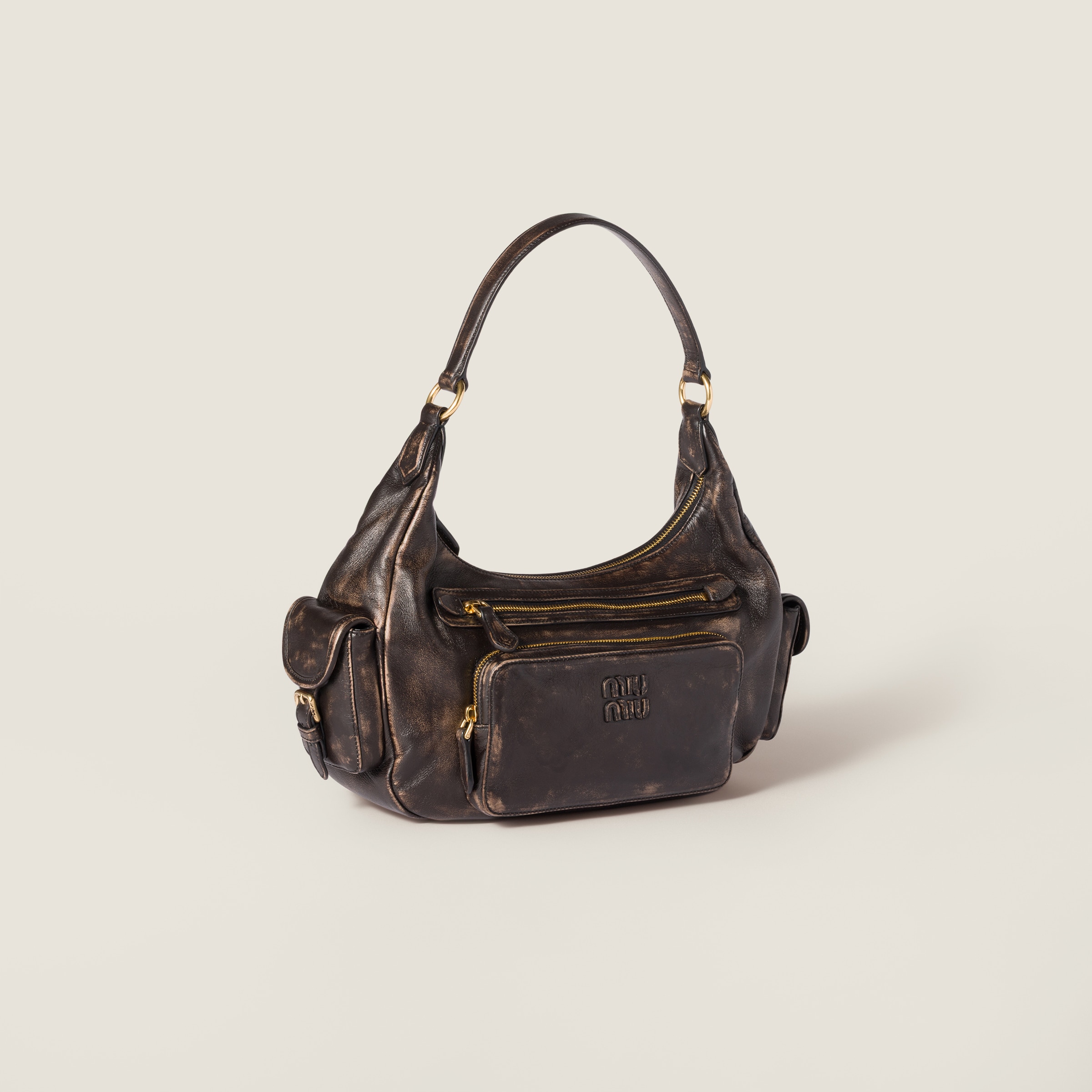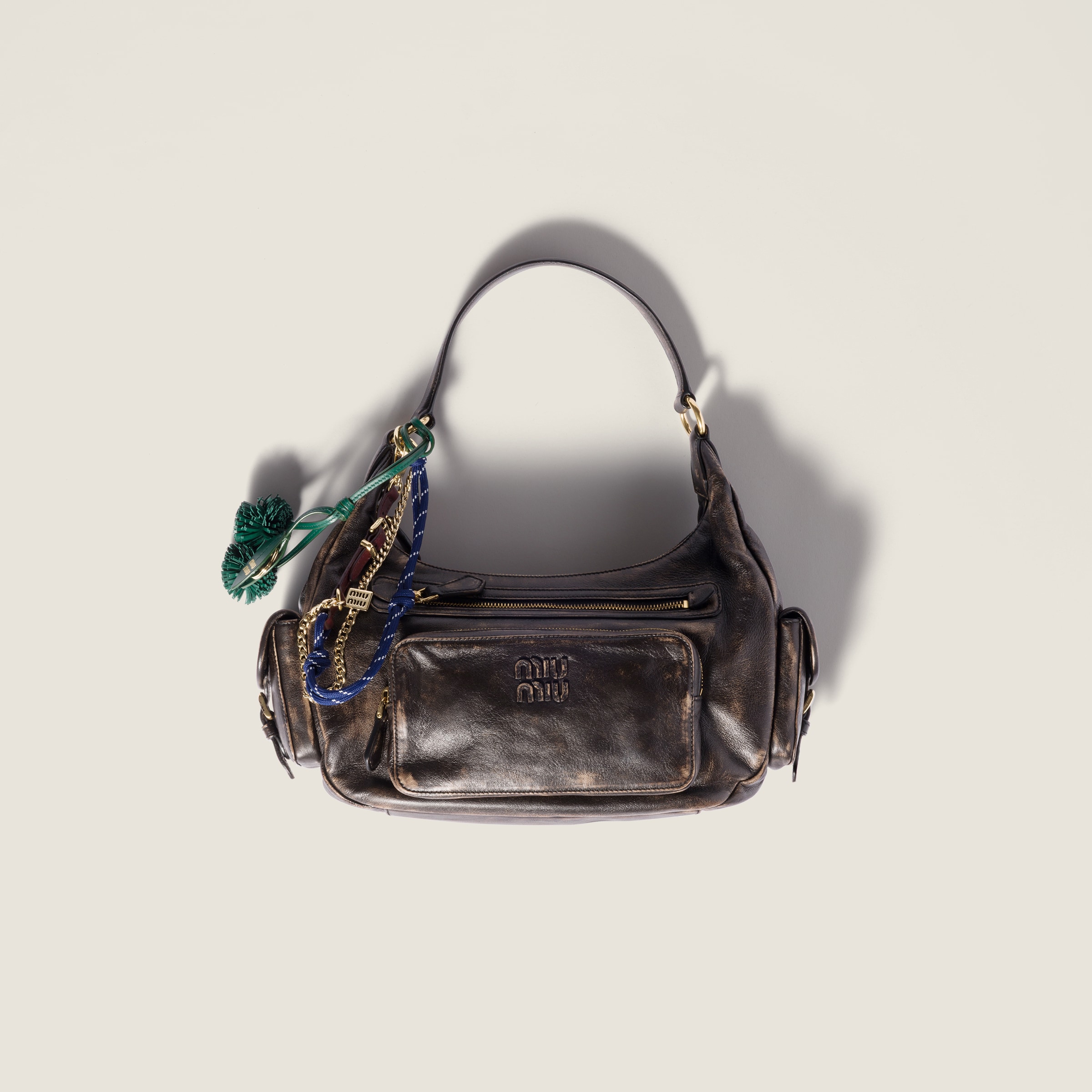 Неоспоримый многокарманный дизайн сумки Pocket воплощает изысканную функциональность стиля Miu Miu. Эта мягкая версия из состаренной наппы выделяется своими новыми объемами и уникальными деталями.