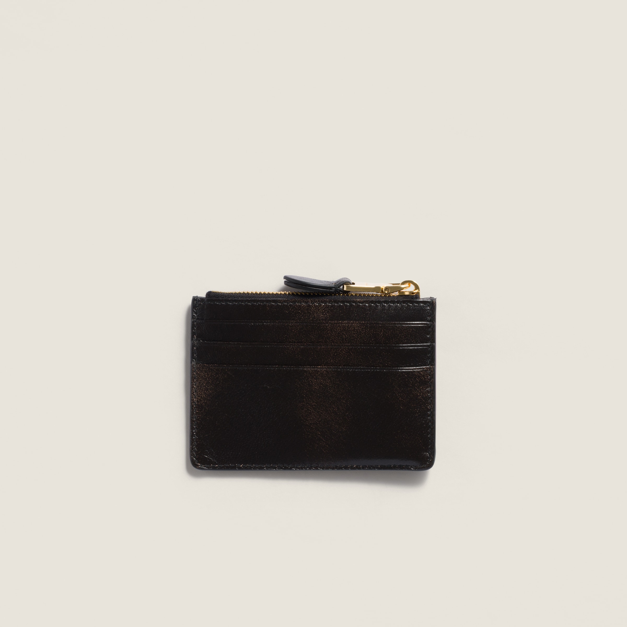 Преднамеренно состаренный эффект наппа-кожи и фирменный акцент в виде логотипа Miu Miu обогащают простые линии нового держателя для карт. Отделения для карт и кольцо для ключей дополняют дизайн функциональными деталями.