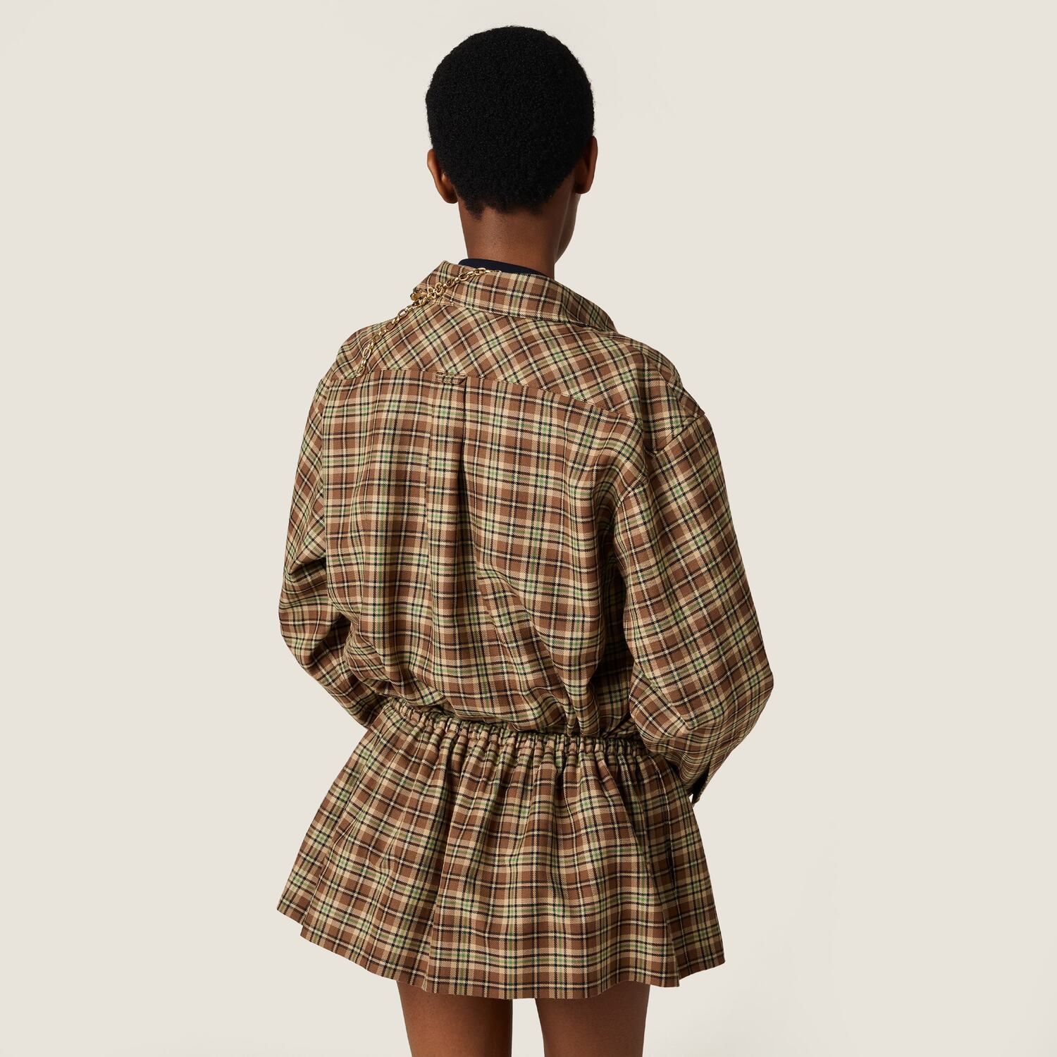 Эта рубашка отражает эксперименты Miu Miu с мужским стилем: клетчатый узор в винтажном настроении, свободный крой и вышитый тональный логотип с буквами определяют культовую, современную индивидуальность.