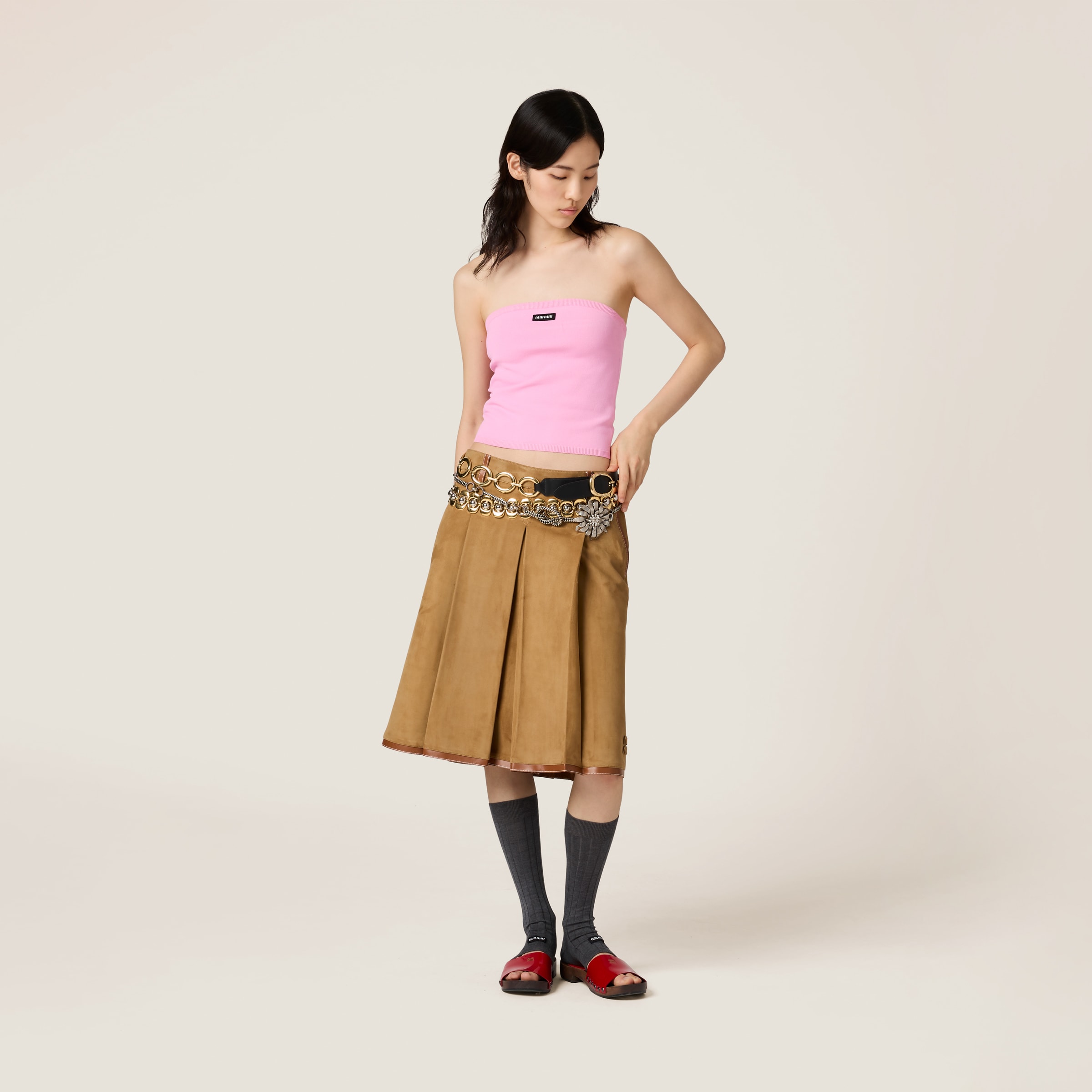 В этом топе из вискозы угадываются намеки на лето благодаря его лаконичному крою. Силуэт в виде топа-бандо придает образу культовый современный акцент, который подчеркивается нашивкой с логотипом контрастного цвета.