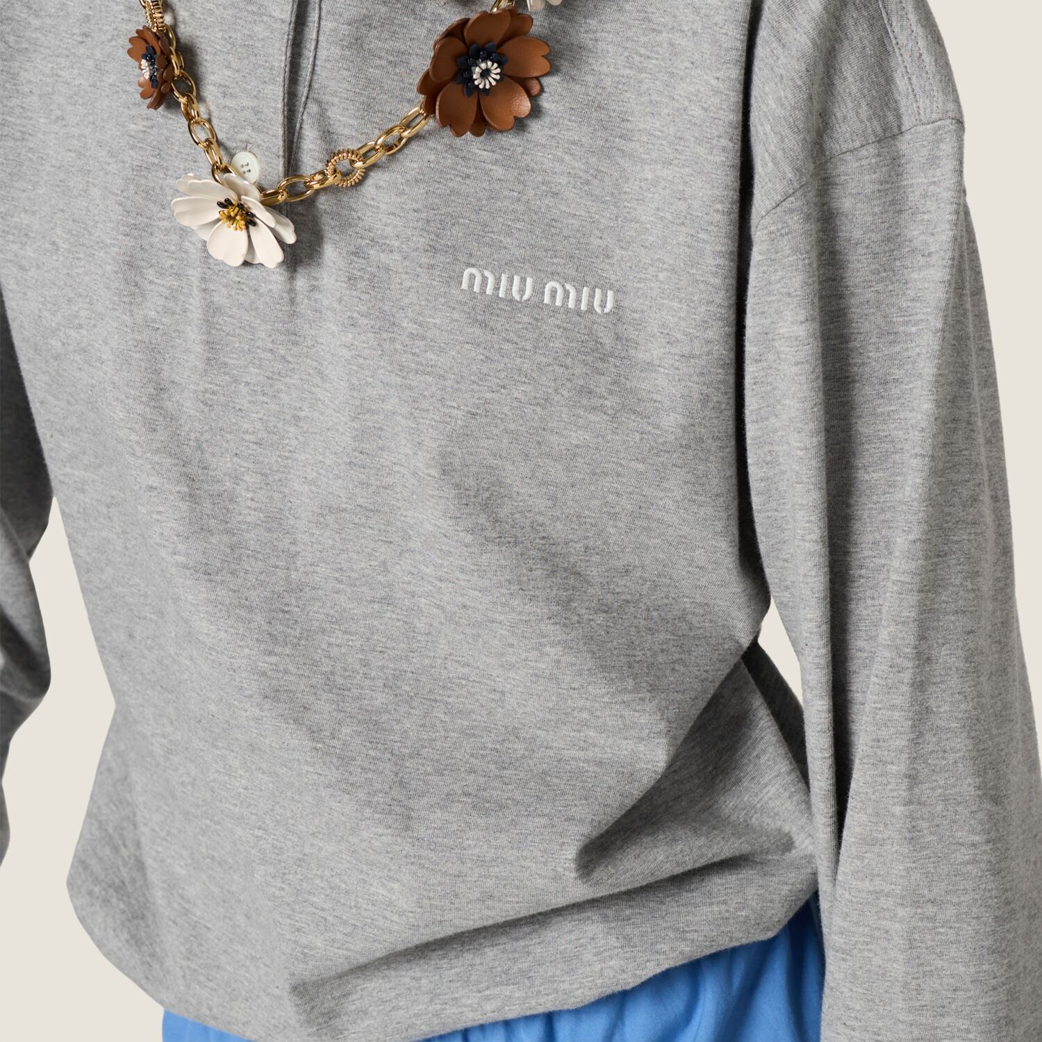 Джерси, культовая ткань в гардеробе Miu Miu, переосмысливает простой характер поло, играя с классикой мужского стиля и подчеркивая его расслабленную и современную универсальность.