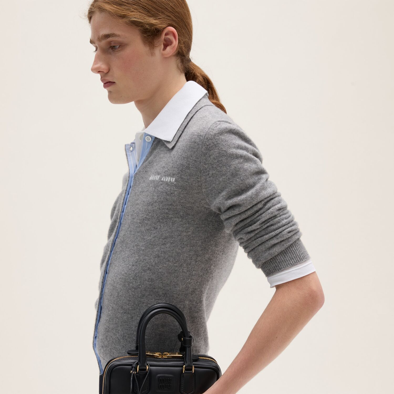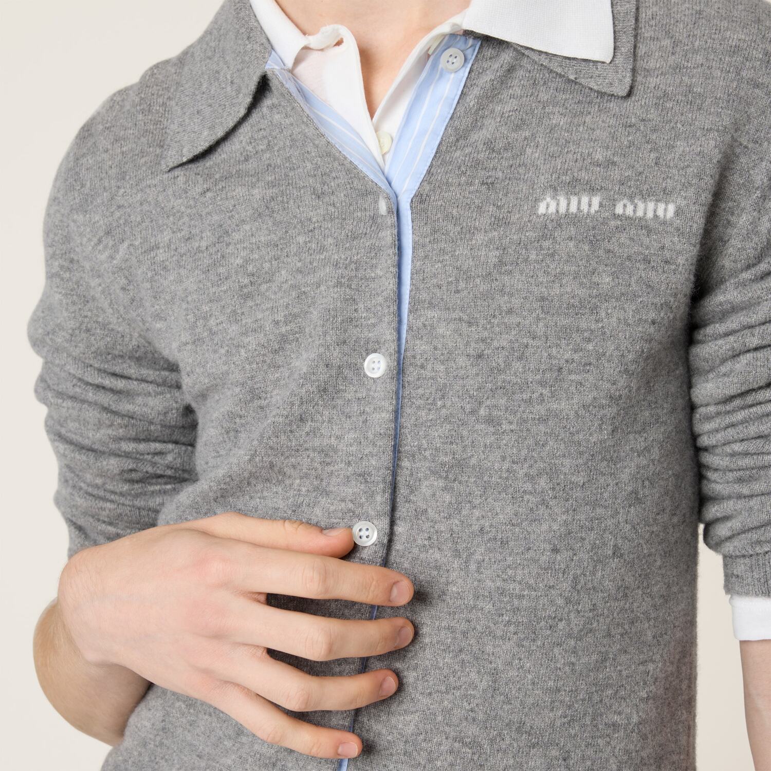 Мягкий кашемир гладкой вязки подчеркивает прилегающий крой этого кардигана, а хлопковые детали обыгрывают характерные элементы мужского гардероба, добавляя современное звучание классическому стилю Miu Miu.