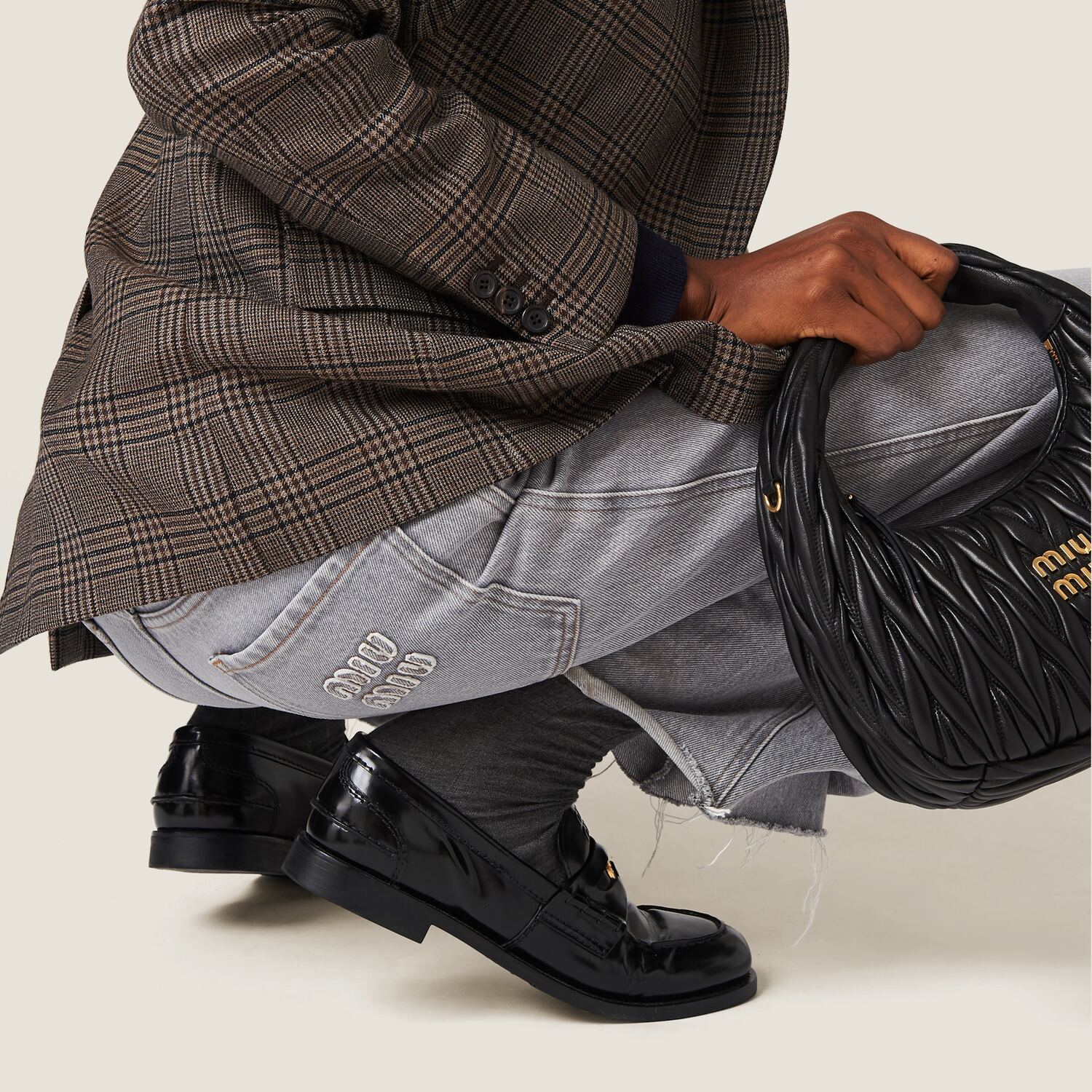 Вечный характер денима встречается с дерзким стилем Miu Miu в этих брюках. Свободный крой создает непринужденный образ, а вышитый логотип выделяется культовой деталью на одном из задних карманов.