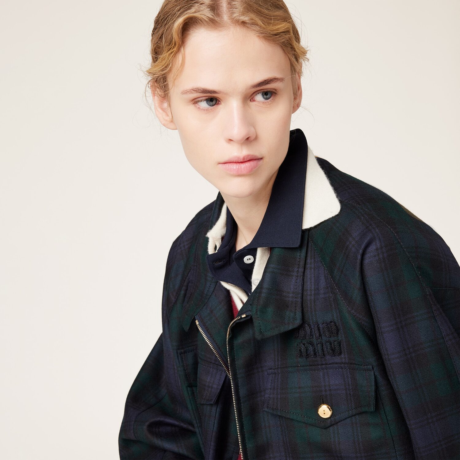Элегантность в стиле жизни и отсылки к классическому мужскому гардеробу определяют характер этой укороченной куртки из шерсти в клетку. Игра различных фактур и фирменная вышивка логотипа создают изысканное сочетание, дополненное деталями в виде стойки-воротника и манжет на пуговицах.