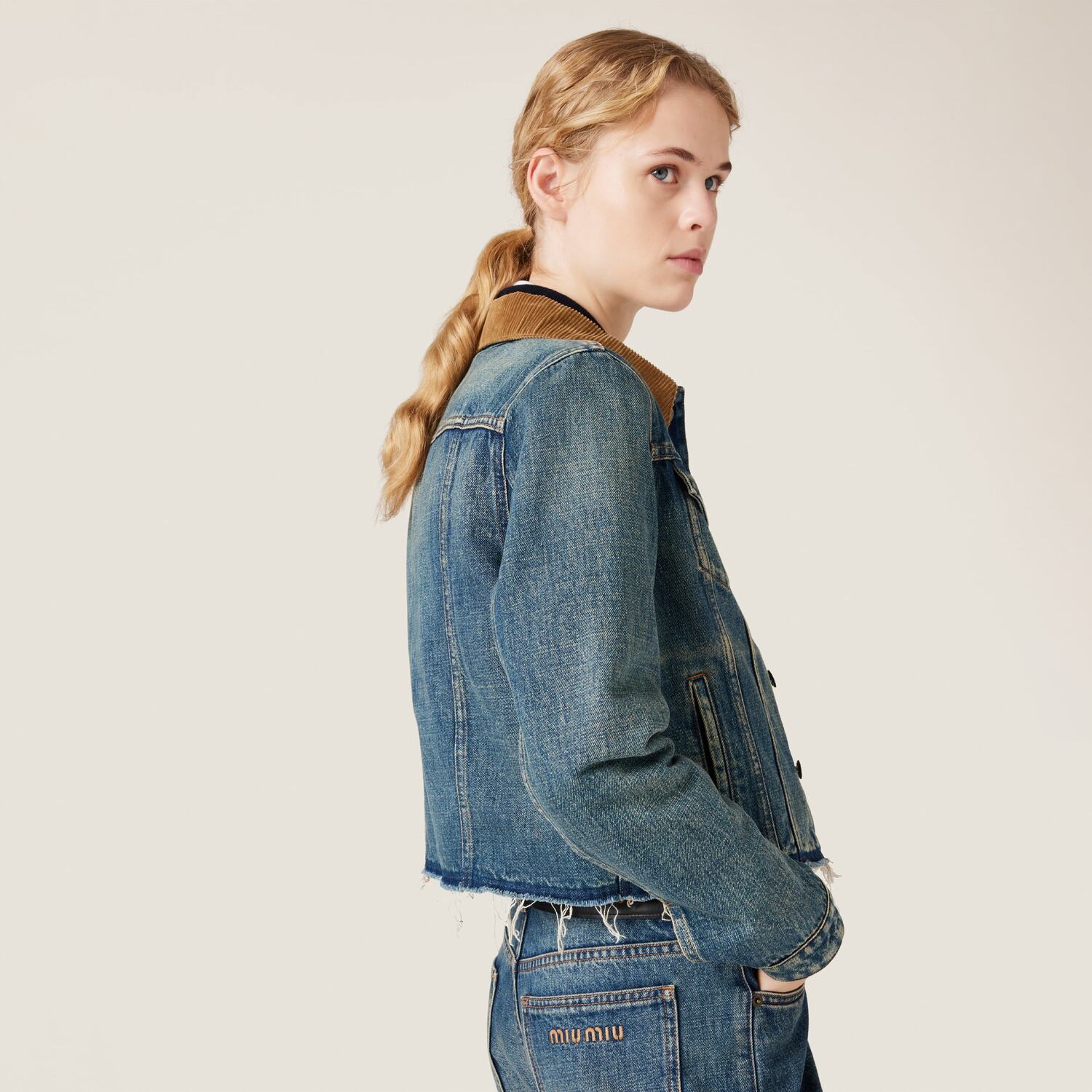Деним, отличительная ткань гардероба Miu Miu, дополняется деталями в этом приталенном блузоне. Бархатный воротник и необработанный край подола придают модели универсальную современность.