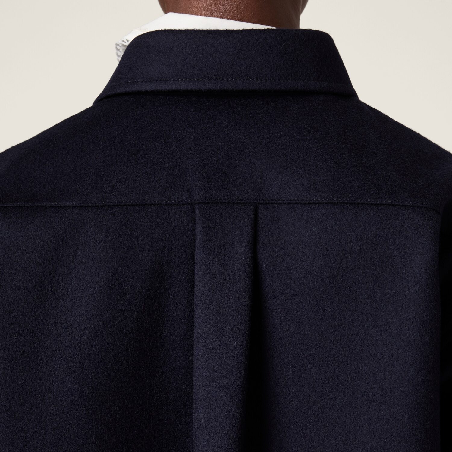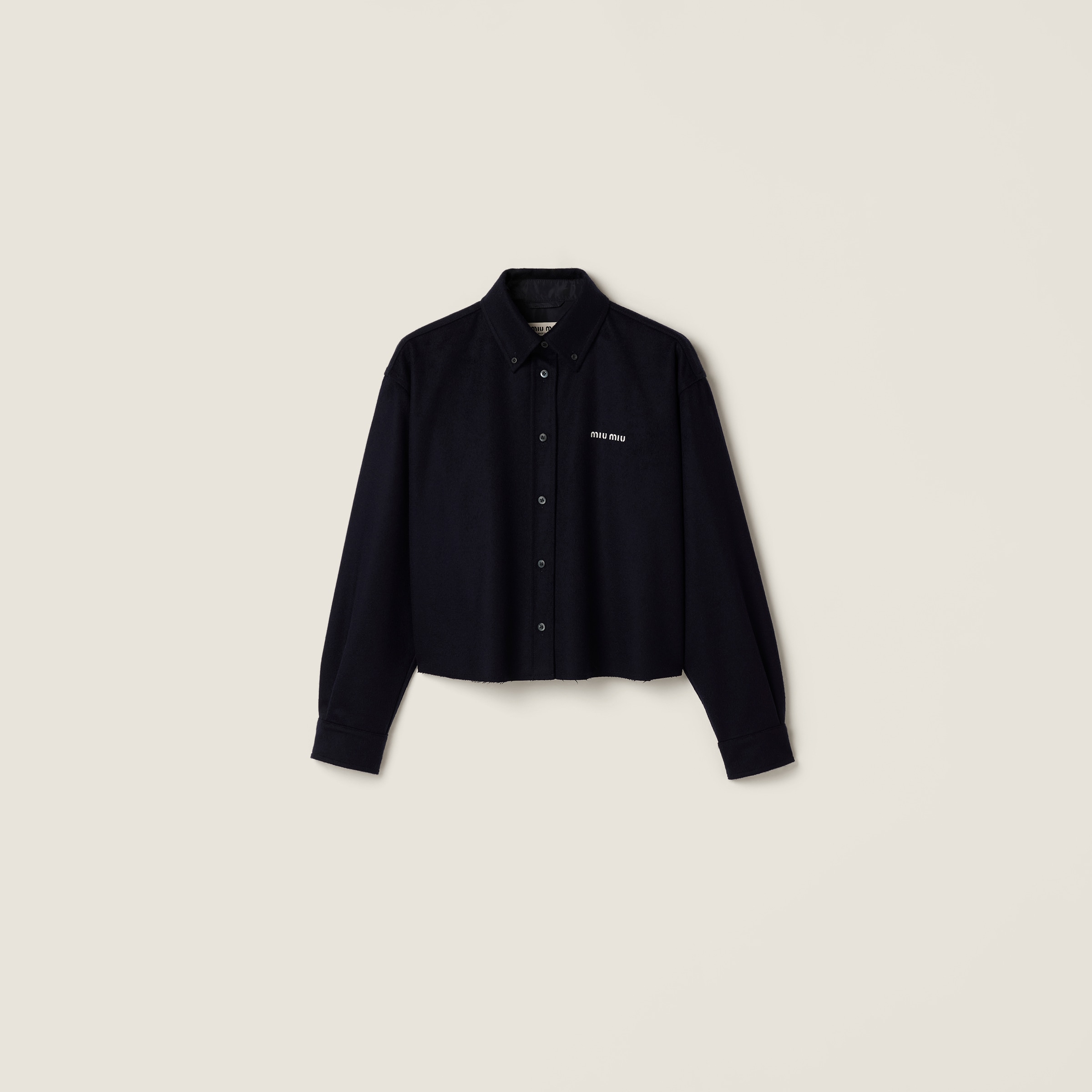 Знаковая рубашка Miu Miu переосмыслена в этом укороченном варианте из велюровой шерсти, сочетающем мужские элементы с молодой, современной эстетикой.