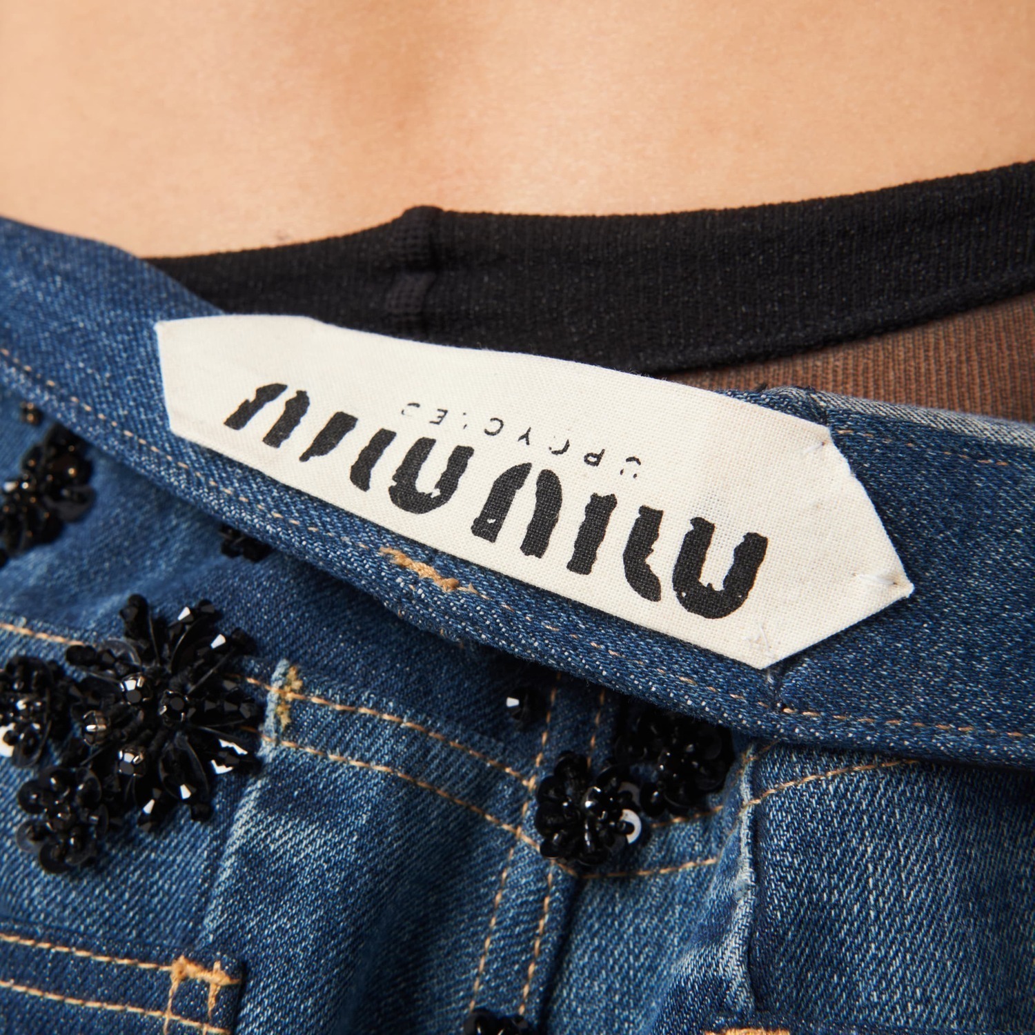 Эти джинсовые шорты являются частью лимитированной коллекции Miu Miu Upcycled, созданной в рамках стремления Miu Miu к экологичной моде и принципам циркулярного дизайна с целью подарить новую жизнь винтажной одежде, сумкам и аксессуарам, которые были переосмыслены и переработаны. Легкий винтажный стиль сочетается с изысканной цветочной вышивкой разного размера и контрастного цвета. Вышитый логотип на спинке завершает дизайн неожиданной иконографической ноткой.