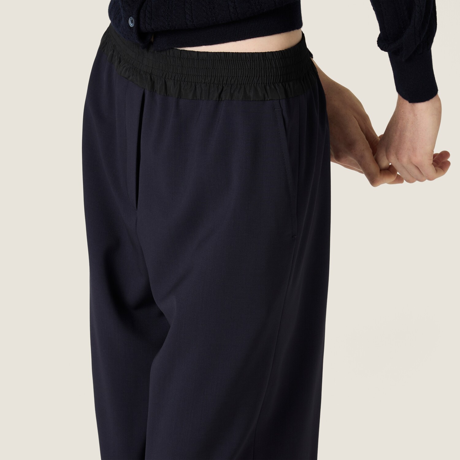 Очень тонкая шерсть придает классический штрих расслабленному силуэту этих брюк, которые по-новому интерпретируют коды Miu Miu. Спортивная деталь на поясе создает игривый и элегантный контраст, подчеркивая баланс между комфортом и стилем.