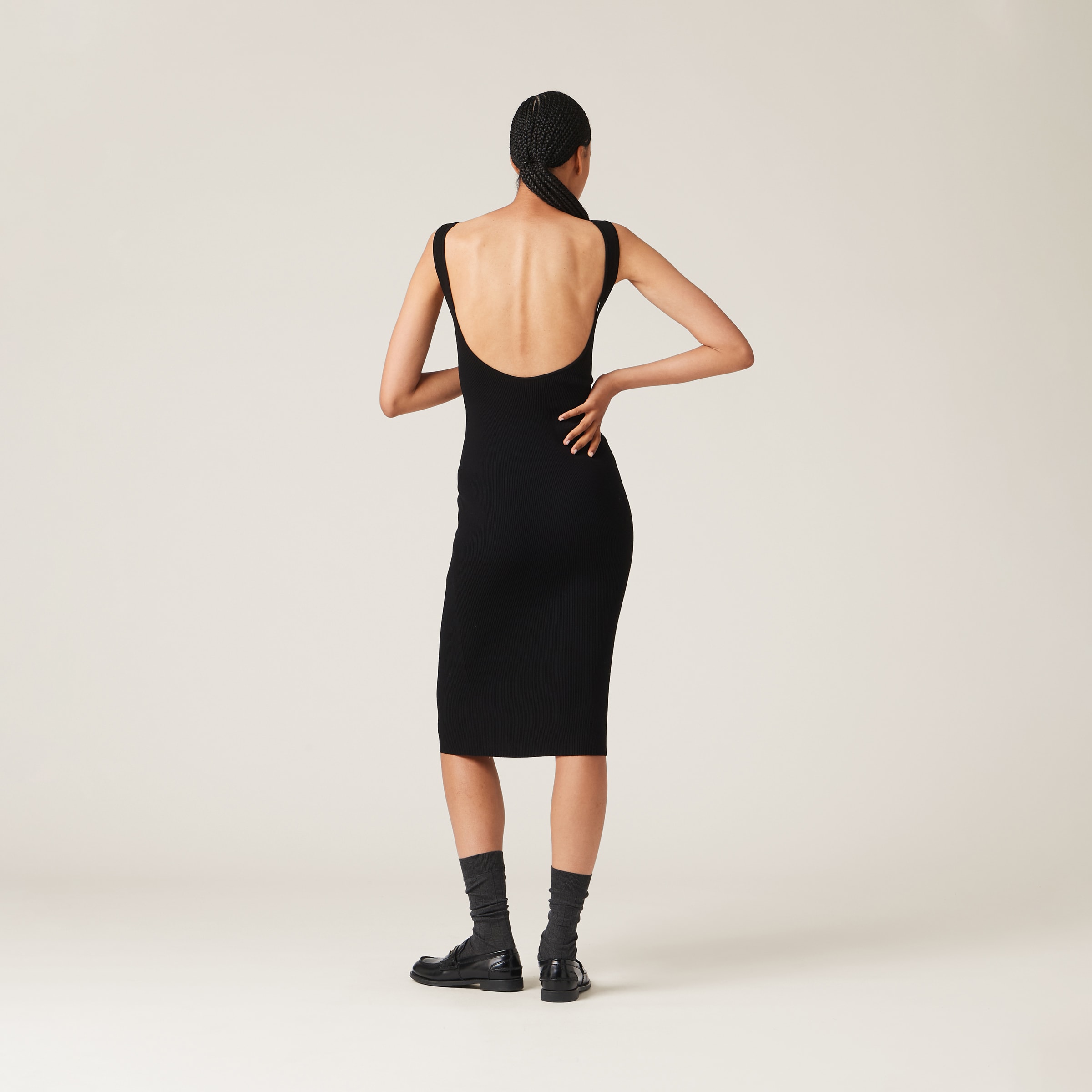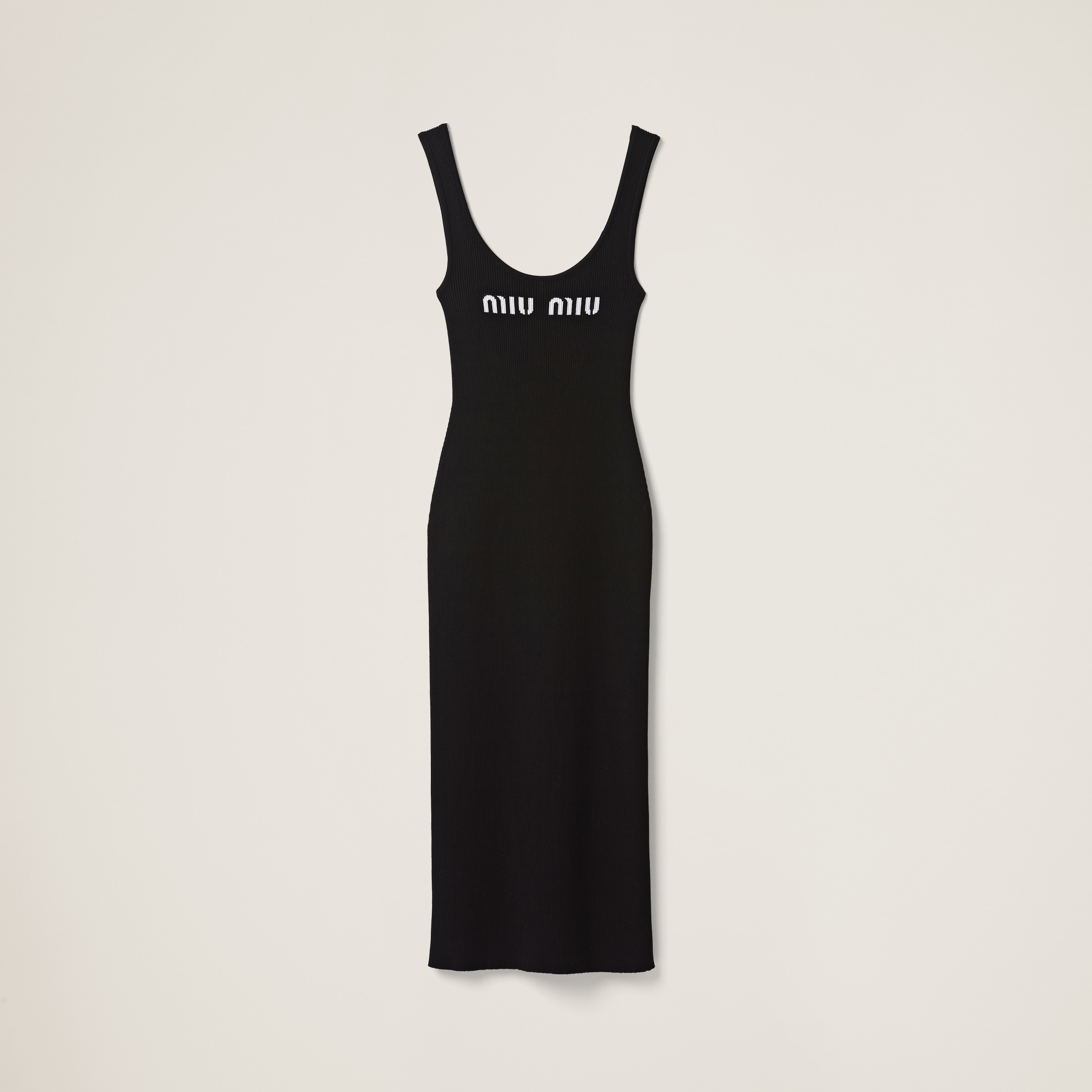 Смелый, культовый стиль Miu Miu сопровождает внешний вид и изящные линии этого нового платья. Платье-футляр, обычно ассоциирующееся с формальной элегантностью, приобретает спортивное настроение благодаря рубчатой вязке, которая покрывает изделие, а интарсия логотипа контрастного цвета добавляет особый акцент.