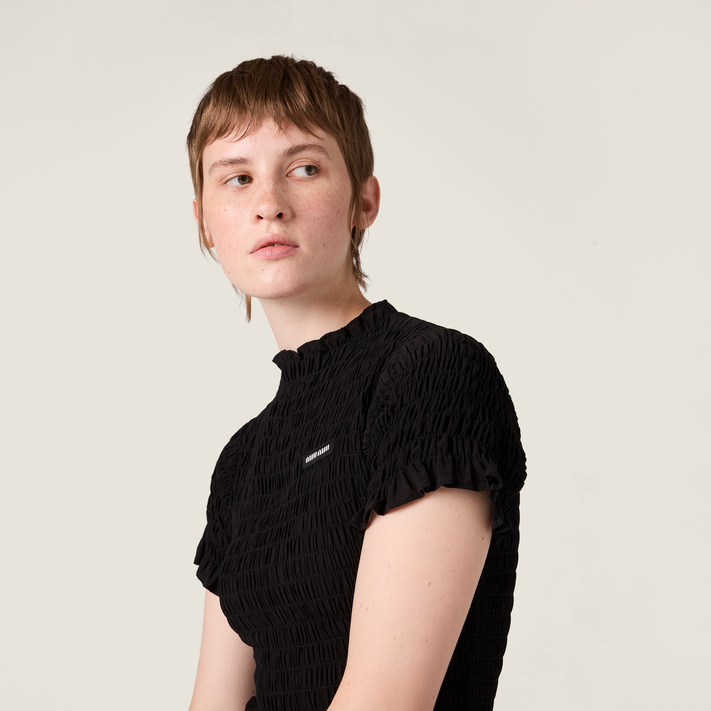 Простые, женственные линии этого платья сочетаются с изысканным жатым креп-шифоном и сборками в смелом, элегантном контрасте, который определяет стиль Miu Miu.