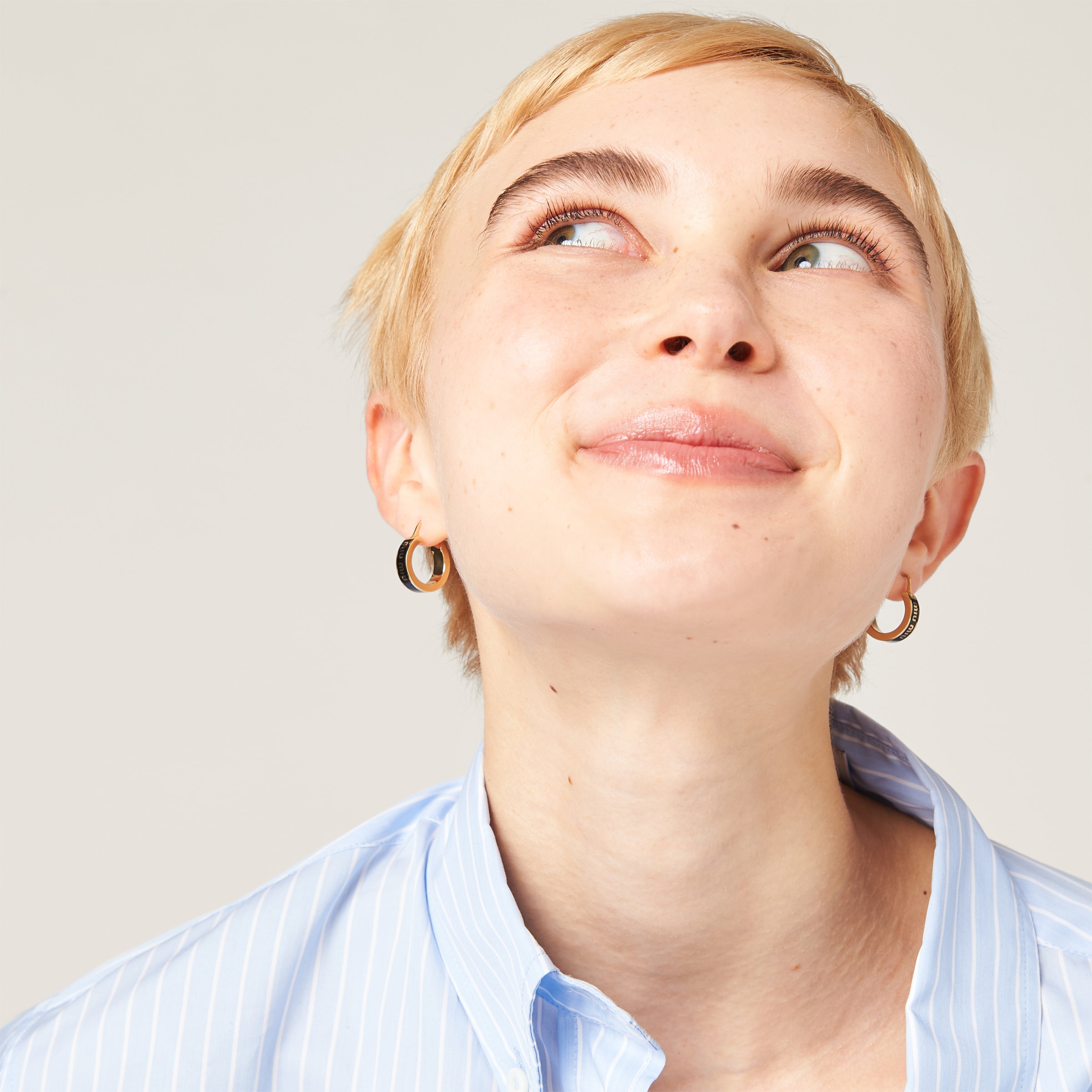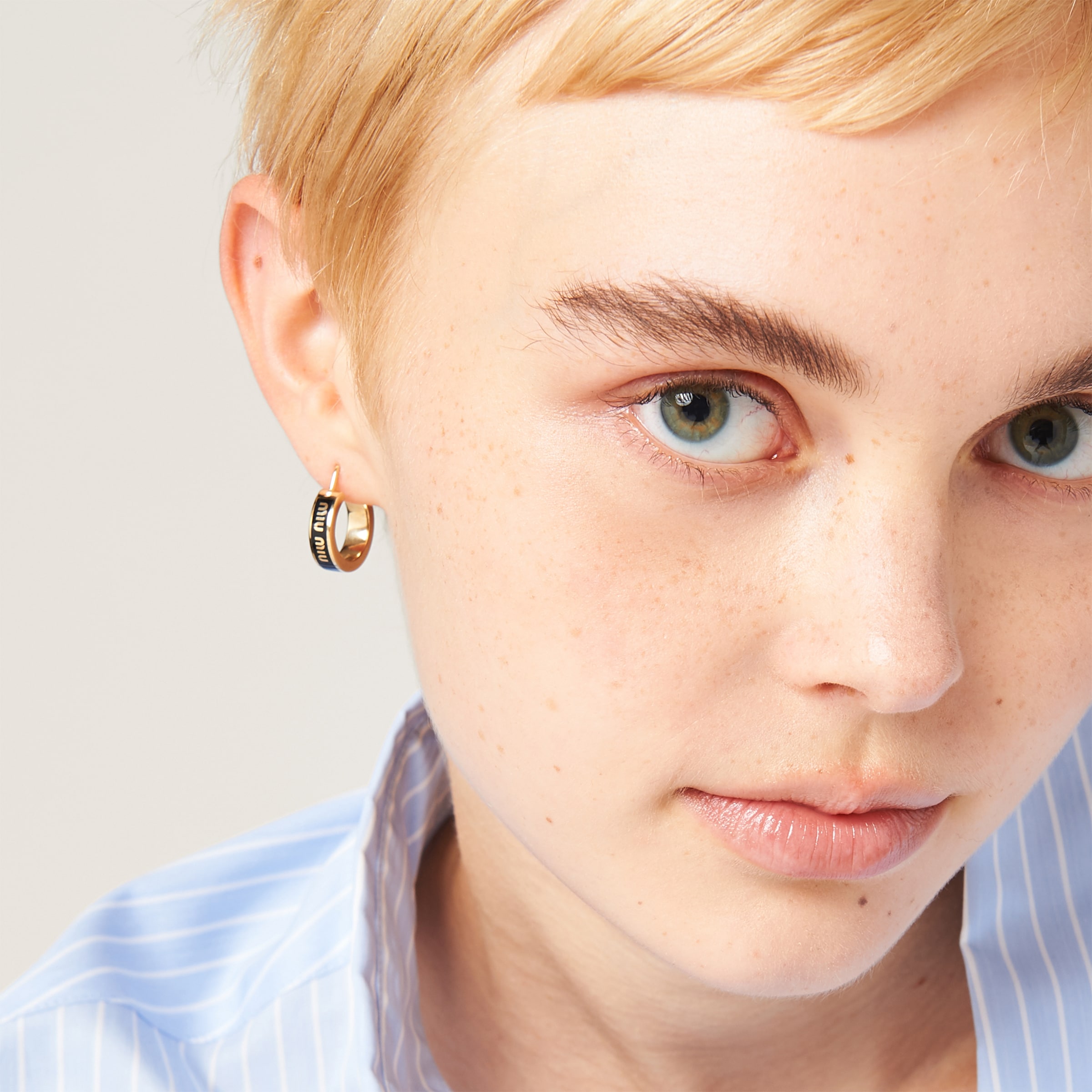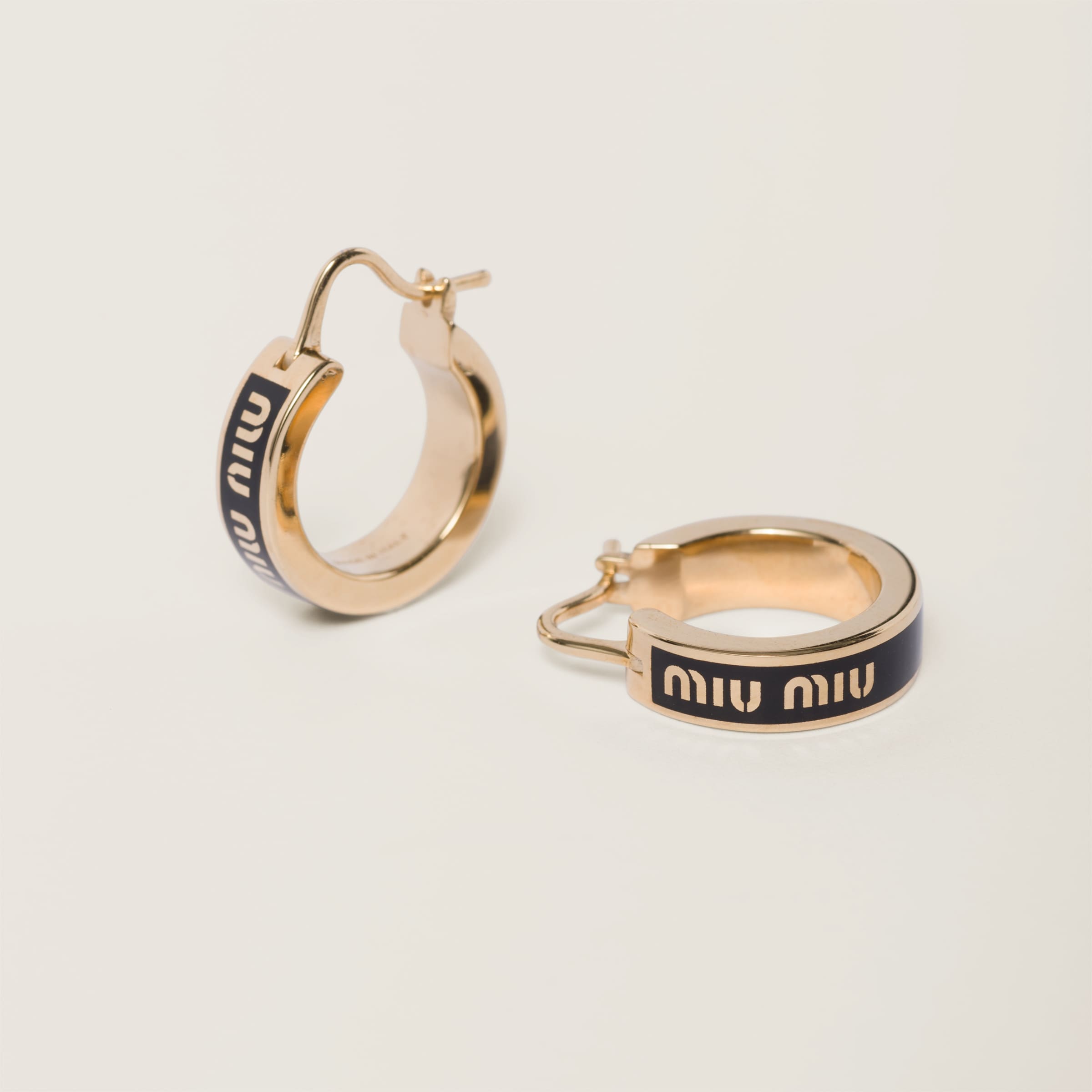 Логотип Miu Miu становится главным элементом в подборке серег из эмалированного металла, форма которых напоминает круг. Логотип выделяется как культовый символ, придавая аксессуару современное очарование.