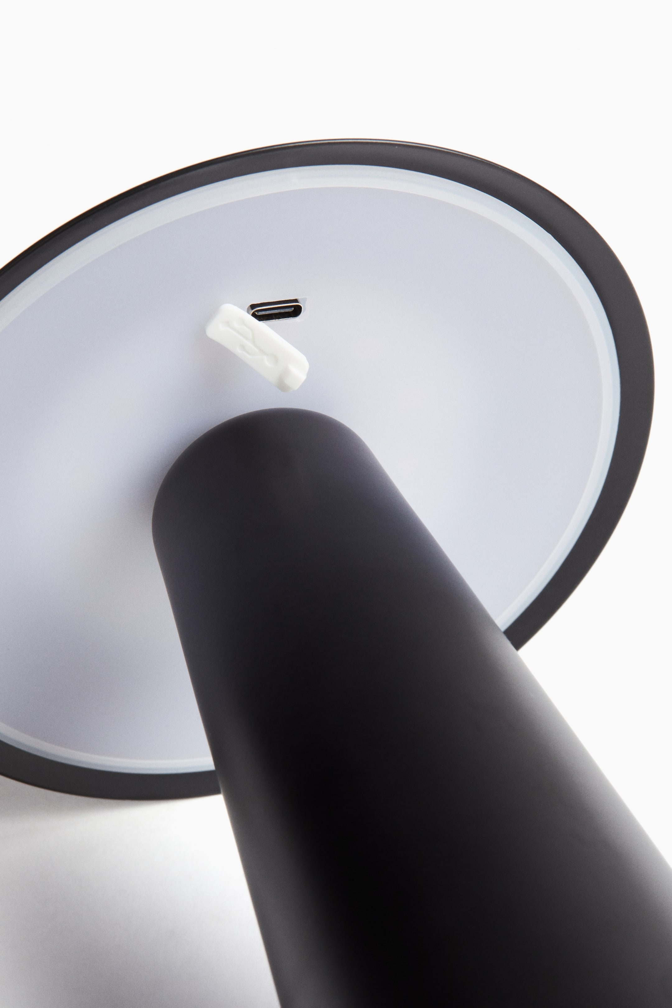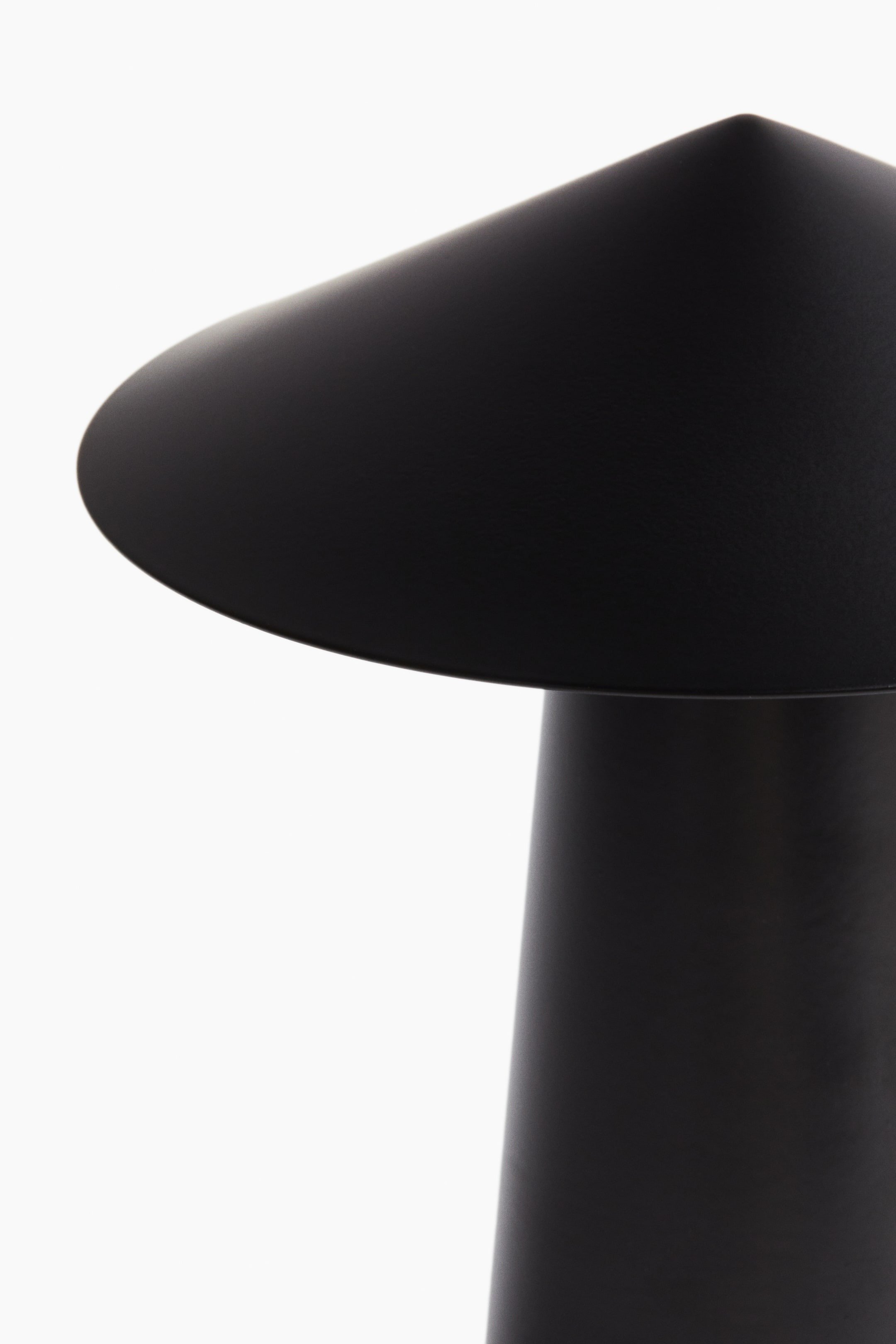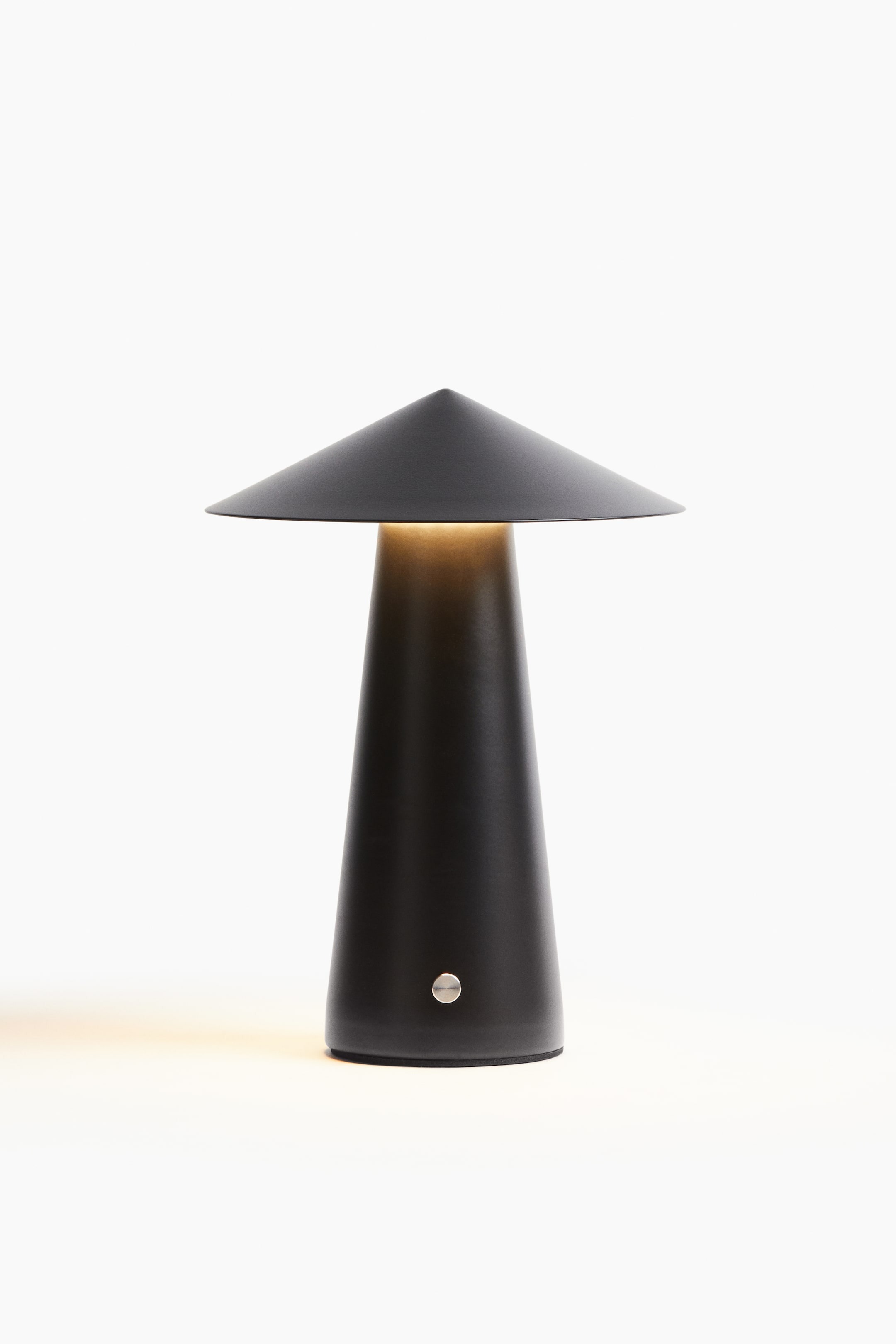 Перезаряжаемая металлическая настольная лампа для использования на открытом воздухе. Геометрический дизайн и трехступенчатая регулировка яркости.