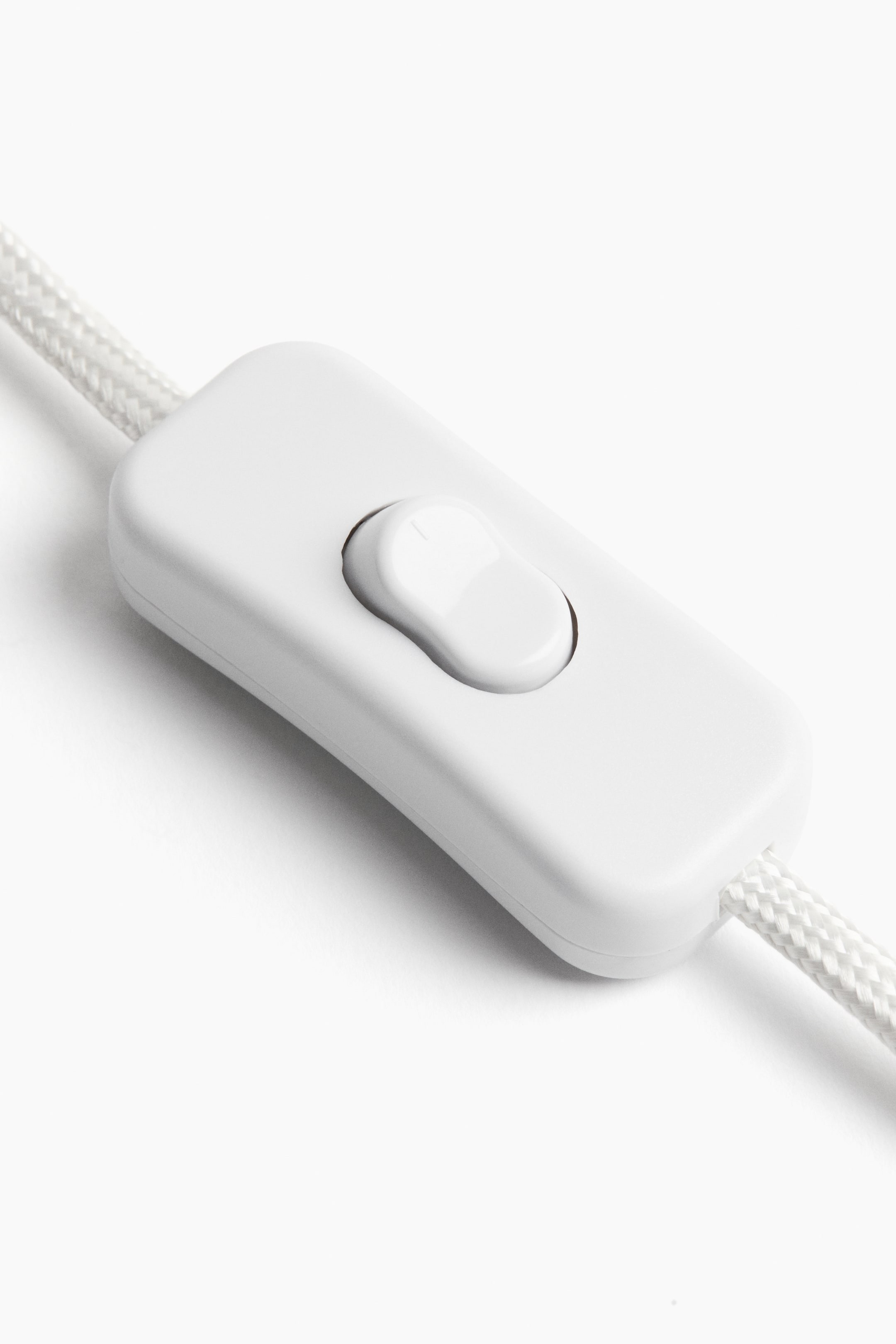 Настольная лампа с геометрическим основанием из керамики и коническим абажуром из плотной хлопчатобумажной ткани. Шнур в тканевой оплетке с пластиковым выключателем.