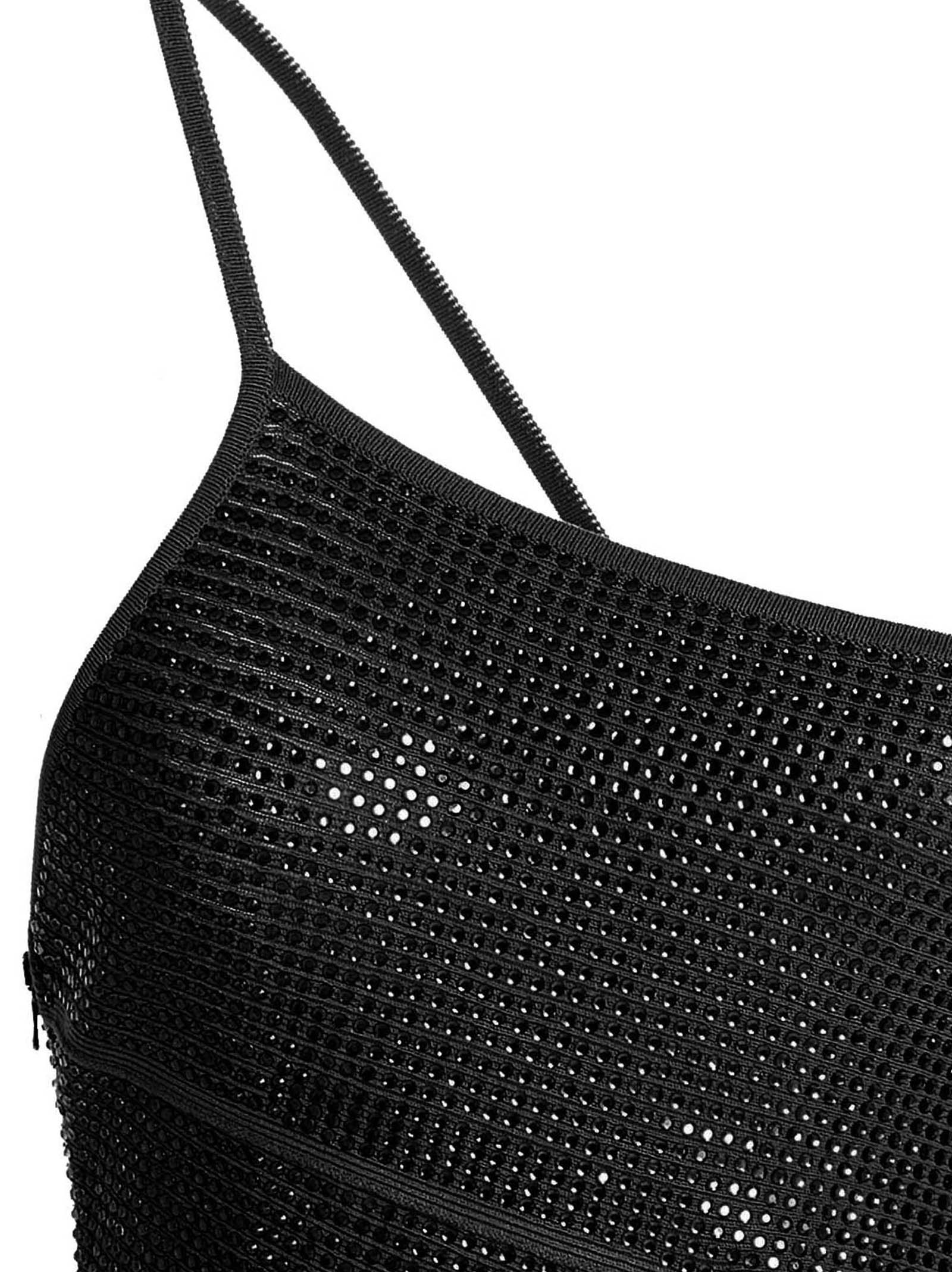 Вязаное платье на одно плечо с пайетками по всей поверхности, застежкой на молнию, вырезом и асимметричным подолом.