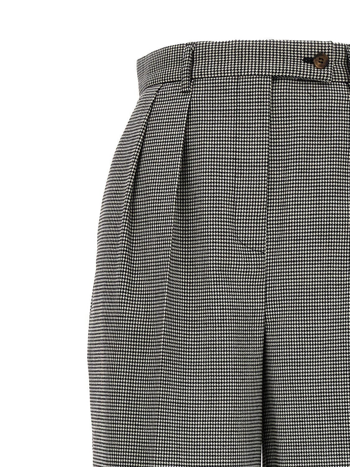 Шерстяные брюки с узором «гусиная лапка», широкими штанинами, складками, застежкой на молнию и пуговицу.