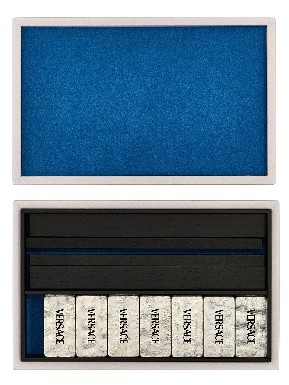Доска для домино с принтом Barocco, характеризующаяся кожаной внешней отделкой и внутренней отделкой из замши и дерева. Фишки украшены логотипом, выгравированным на радужном фоне с одной стороны, и точками в форме Медузы - с другой.