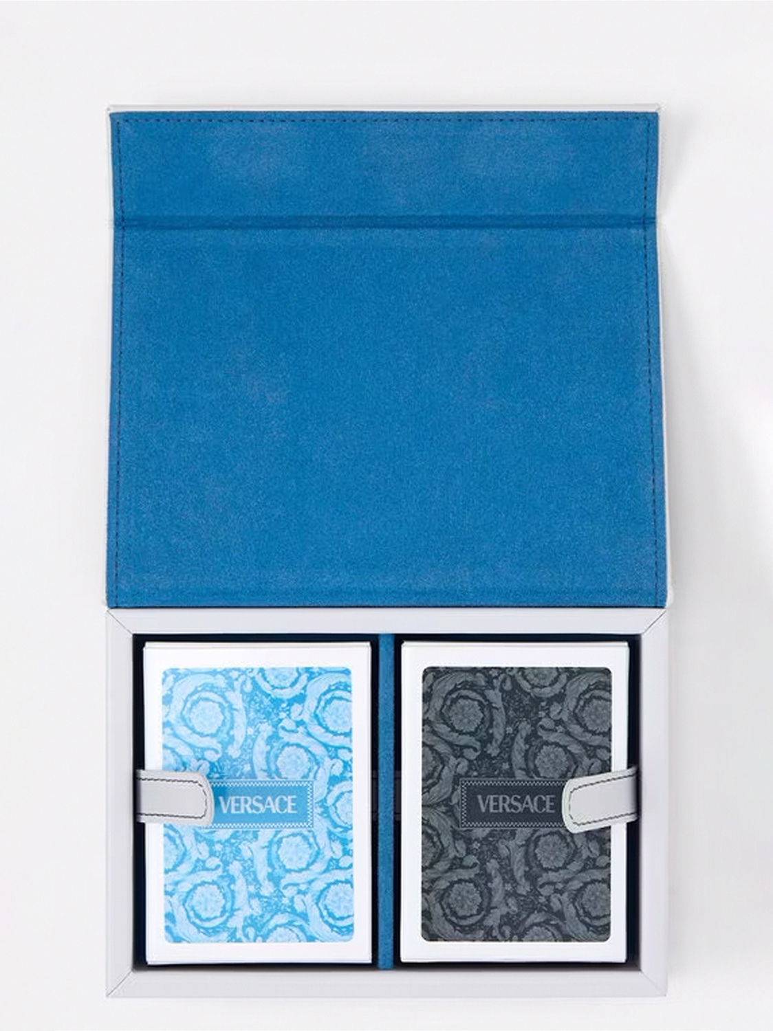 Набор игральных карт содержит две колоды по 54 карты в бумажных коробках с принтом Barocco и кожаный футляр с замшей внутри и декоративной деталью в виде головы Медузы на складном магнитном замке. Фигуры на картах одеты в культовые модели Versace.