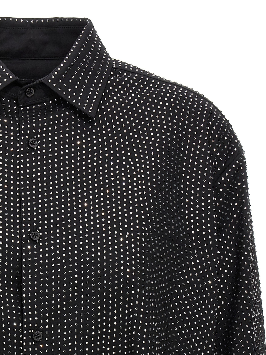 Хлопковая рубашка с декором из страз по всей поверхности, нагрудным карманом, застежкой на пуговицы и длинными рукавами с манжетами.