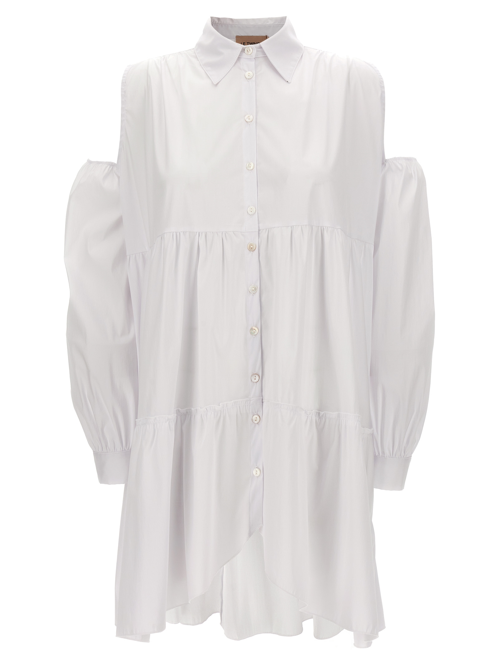 Платье 'Fara' из хлопка с рюшами, деталь открытого плеча с резинкой, длинные рукава, застежка на пуговицы спереди, воротник-рубашка, манжеты на пуговицах.