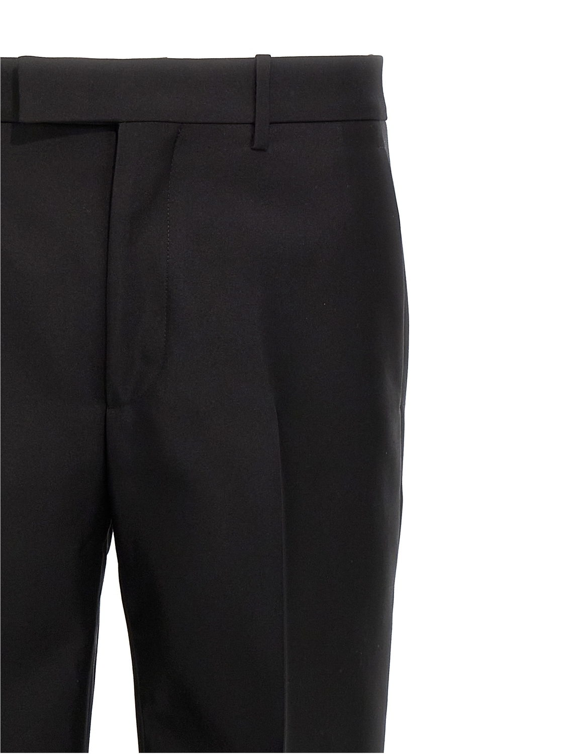 Классические брюки со стрелкой, боковыми и задними карманами на пуговице, застежкой на молнию, крючок и пуговицу, металлический логотип на передней шлевке.