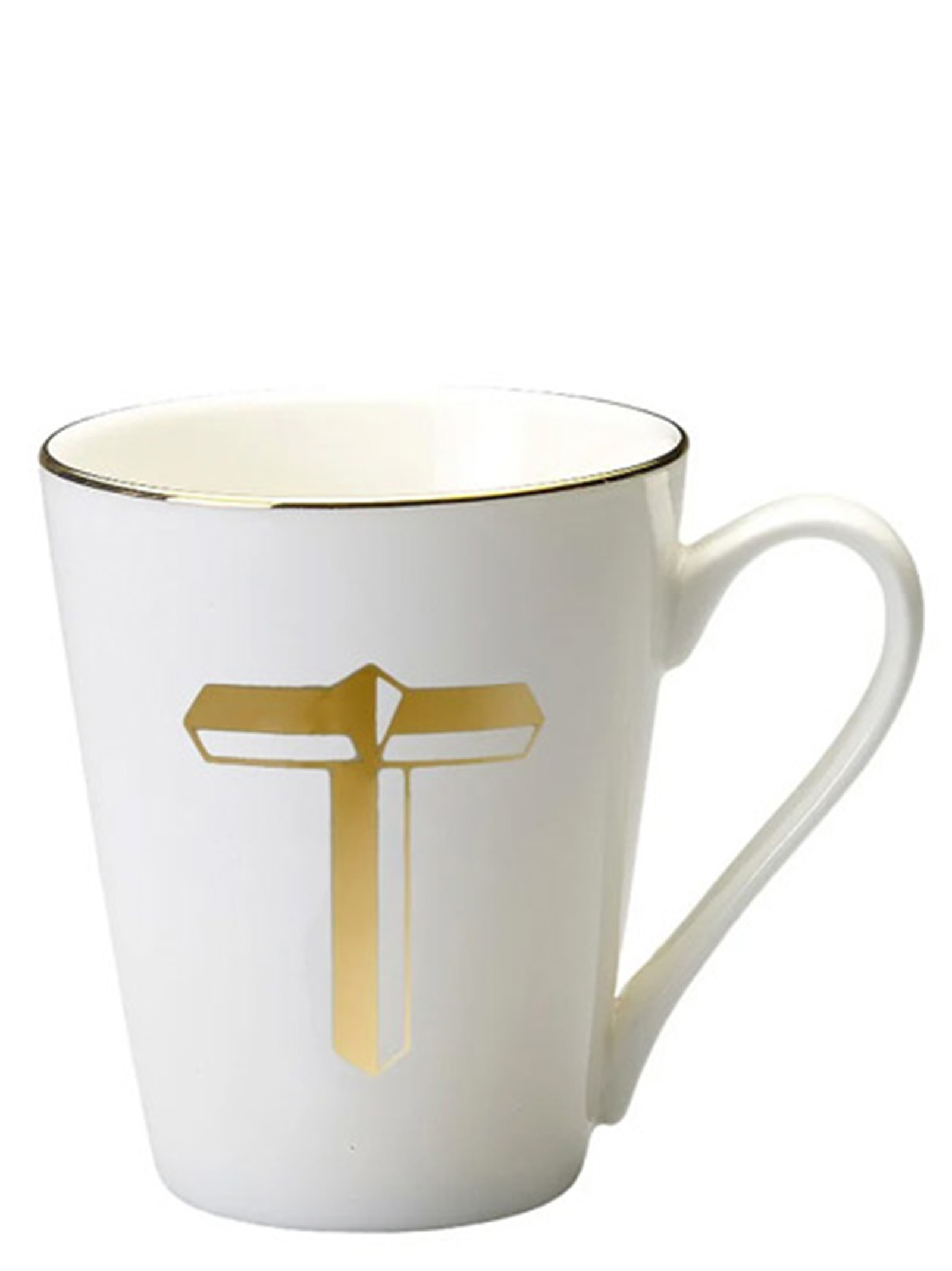 Фарфоровая чашка с золотым декором буквы 'T'.