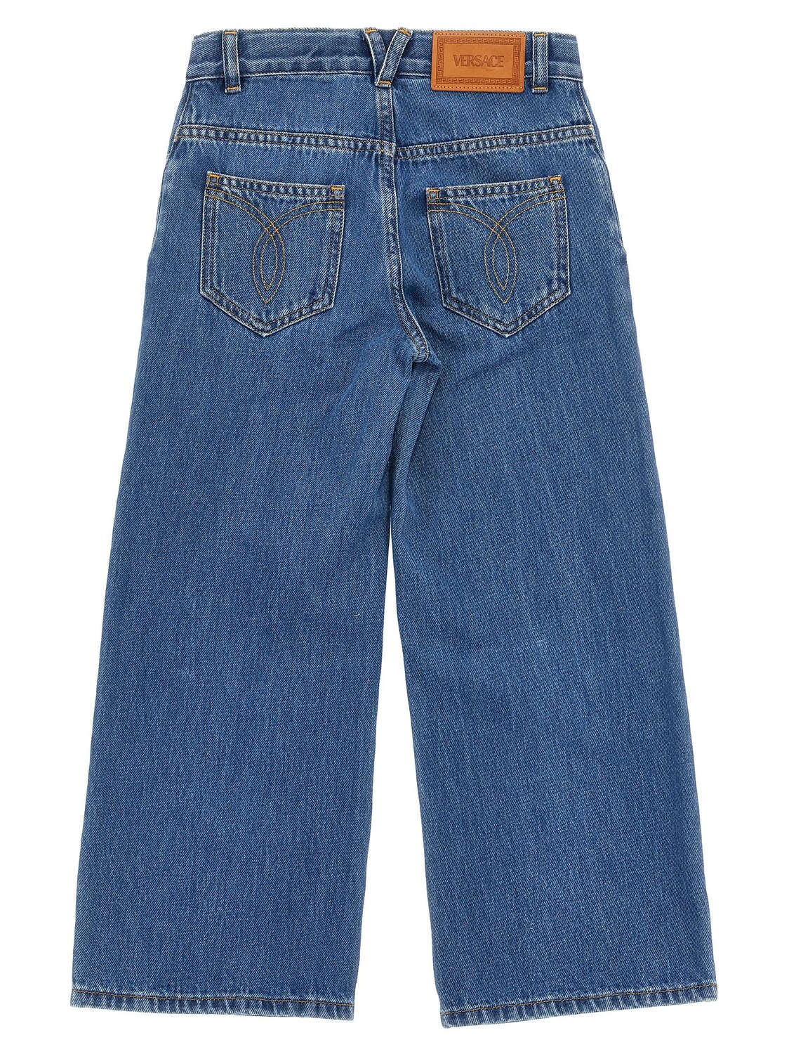 Детские джинсы из хлопкового денима с застежкой на молнию и пуговицу с Медузой, пятью карманами и кожаной нашивкой с логотипом.
