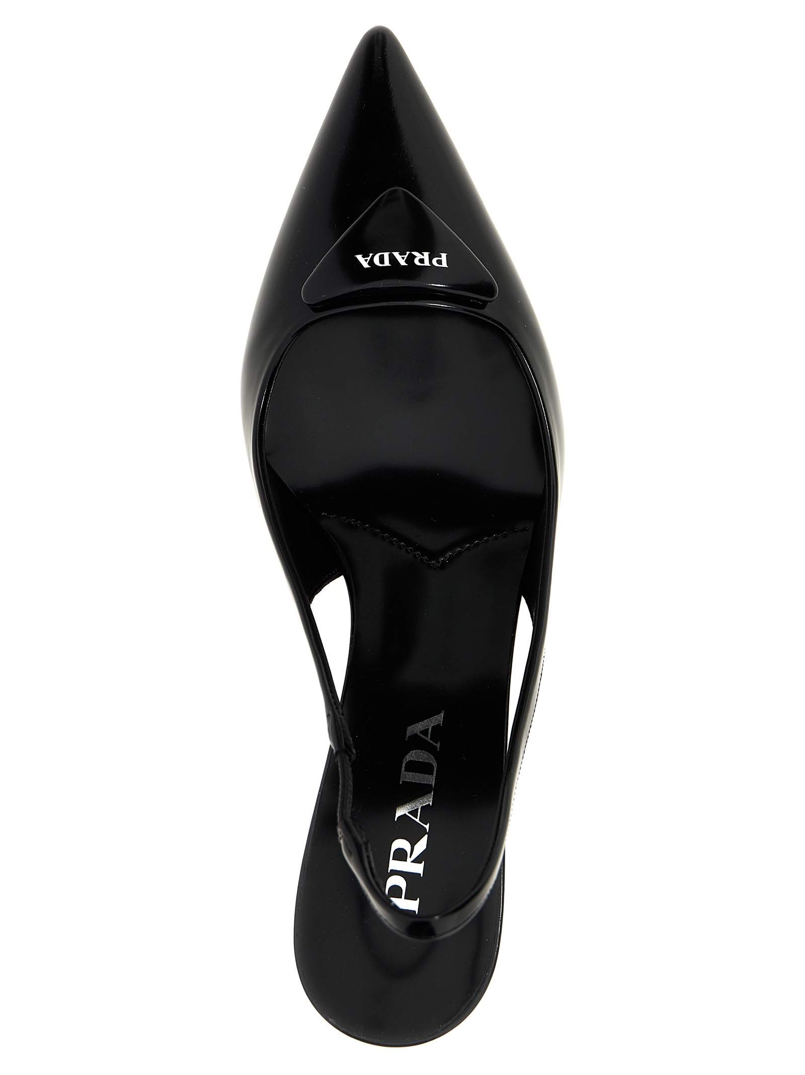 Кожаные туфли-слингбэки с треугольным кожаным логотипом на передней части, эластичным ремешком и скульптурным каблуком.