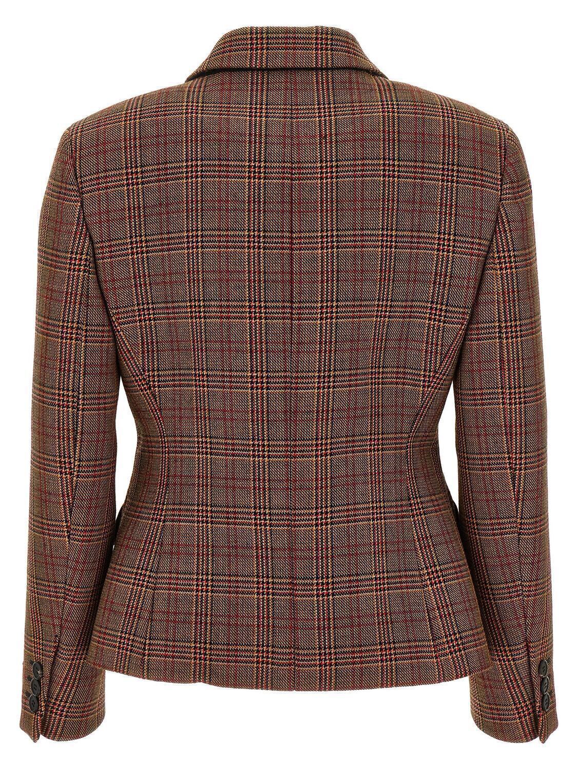 Однобортный блейзер из шерсти в клетку принца Уэльского с застежкой на пуговицы, приталенным силуэтом, карманами, длинными рукавами и структурированными плечами.