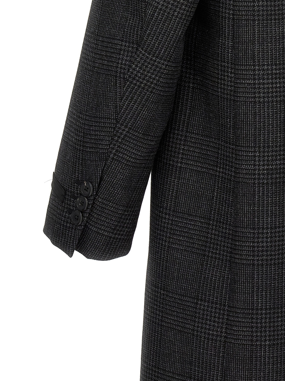 Пальто в клетку из шерсти на одной пуговице, треугольный логотип из ткани на спинке, застежка на пуговицы, карманы, длинные рукава, шлица сзади.