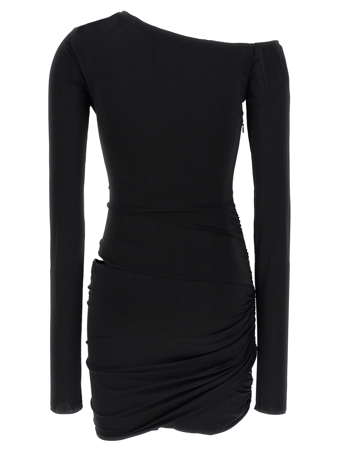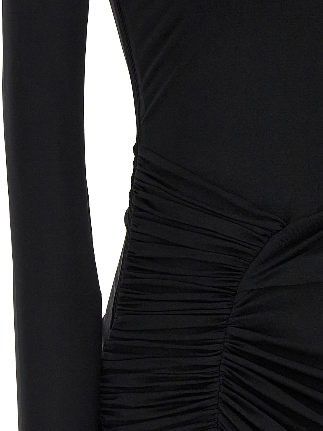 Асимметричное платье из эластичной ткани с вырезом на боку, круглым вырезом горловины и длинными рукавами.