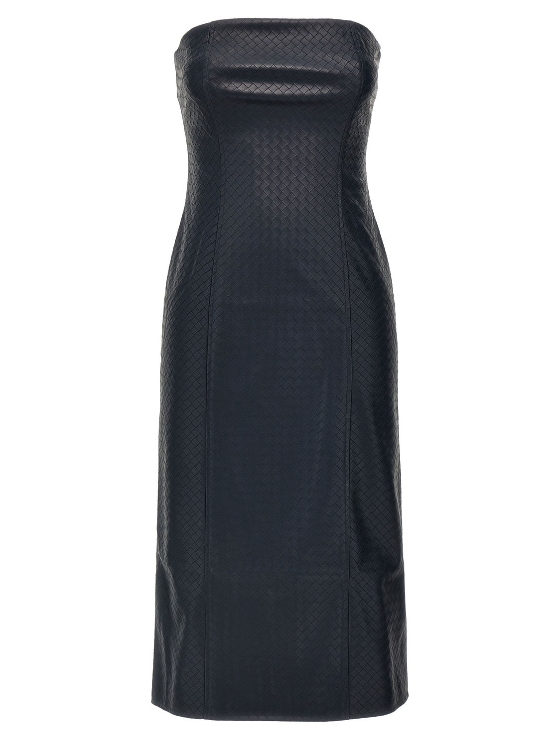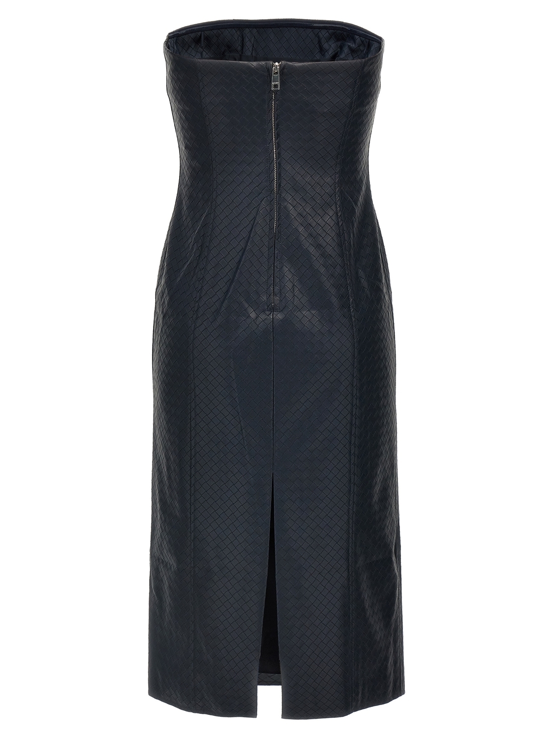 Платье миди «Braided» с открытыми плечами из переплетенной ткани под кожу, с застежкой-молнией и разрезом сзади.