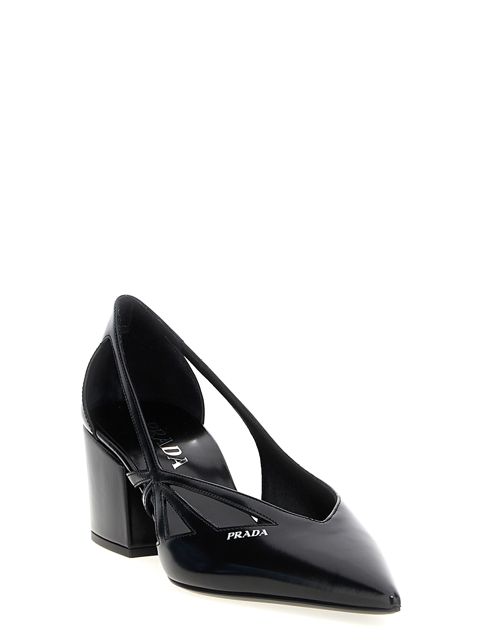 Туфли-лодочки из полированной кожи с вырезами, шелкографическим логотипом и широким каблуком.