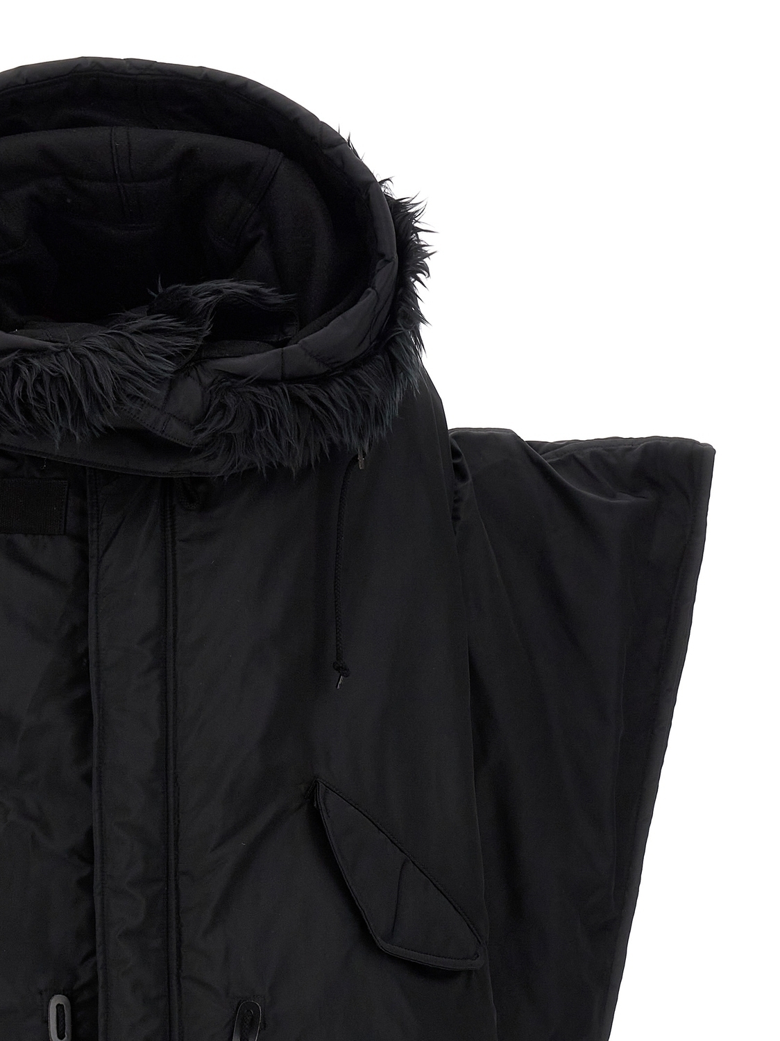Оверсайз пуховик из нейлона с съемным капюшоном с вставкой из искусственного меха, застежкой на молнию и пуговицы, карманами, длинными рукавами с молнией, регулируемым эластичным шнурком по низу.