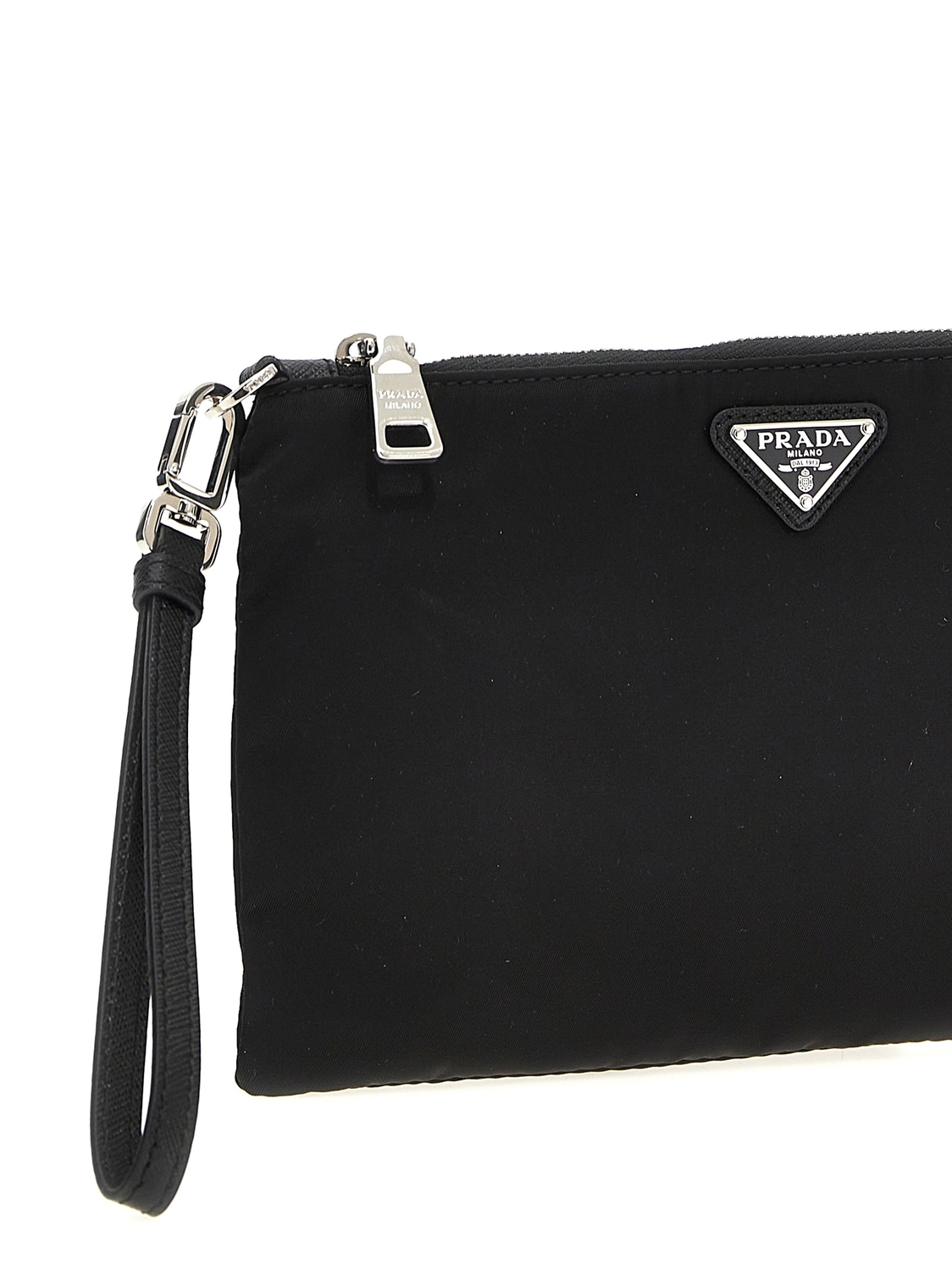 Клатч из Re-Nylon с деталями из сафьяновой кожи, украшенный треугольной эмблемой-логотипом из эмалированного металла на передней части, с застежкой на молнию и съемной ручкой-петлей для запястья.
