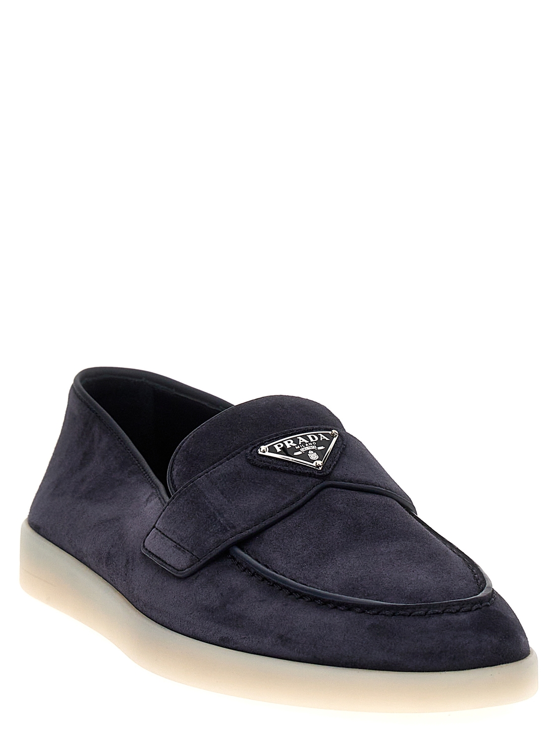 Замшевые лоферы с треугольным эмалированным металлическим логотипом спереди, контрастной резиновой подошвой.