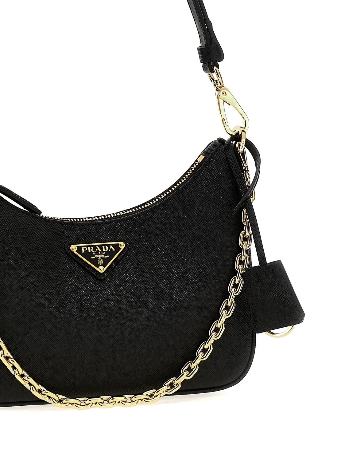 Мини-сумка Prada Re-Edition из сафьяновой кожи с фронтальной эмалированной металлической аппликацией в виде треугольного логотипа, застежкой на молнии, съемной цепочной ручкой, регулируемым и съемным кожаным брелоком.