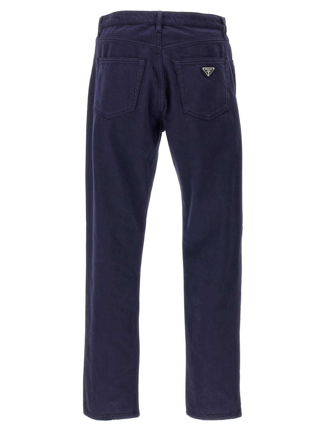 Джинсы из хлопкового денима, окрашенные после изготовления; на спинке - треугольный логотип из эмалированного металла; пять карманов; прямые штанины; застежка на пуговицу.