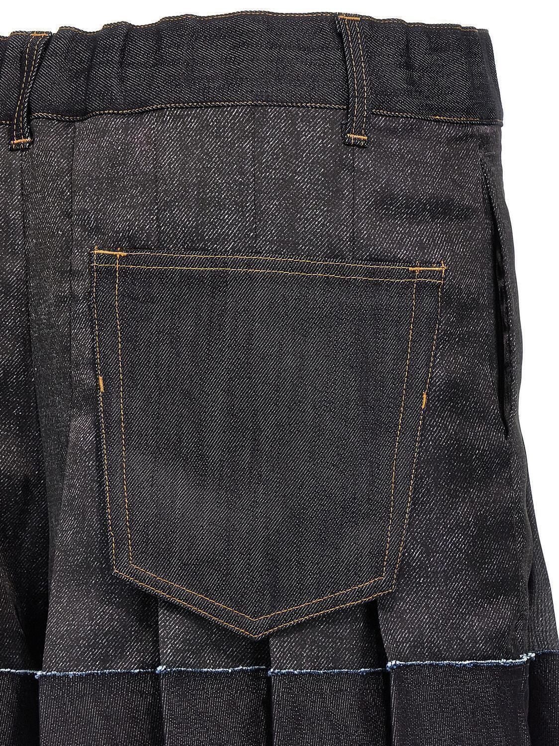 Шорты из синтетической ткани с принтом под деним и деталями из хлопкового денима, модель с оборками и широкими штанинами, застежка на молнию и пуговицу, эластичный пояс, карманы.