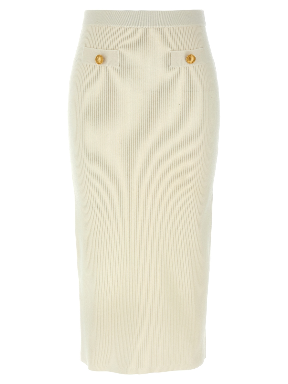 Миди-юбка из ребристой эластичной шерсти и кашемировой смеси, с накладными карманами-тромплей с металлическими пуговицами, на эластичном поясе, карандаш с разрезом сзади.
