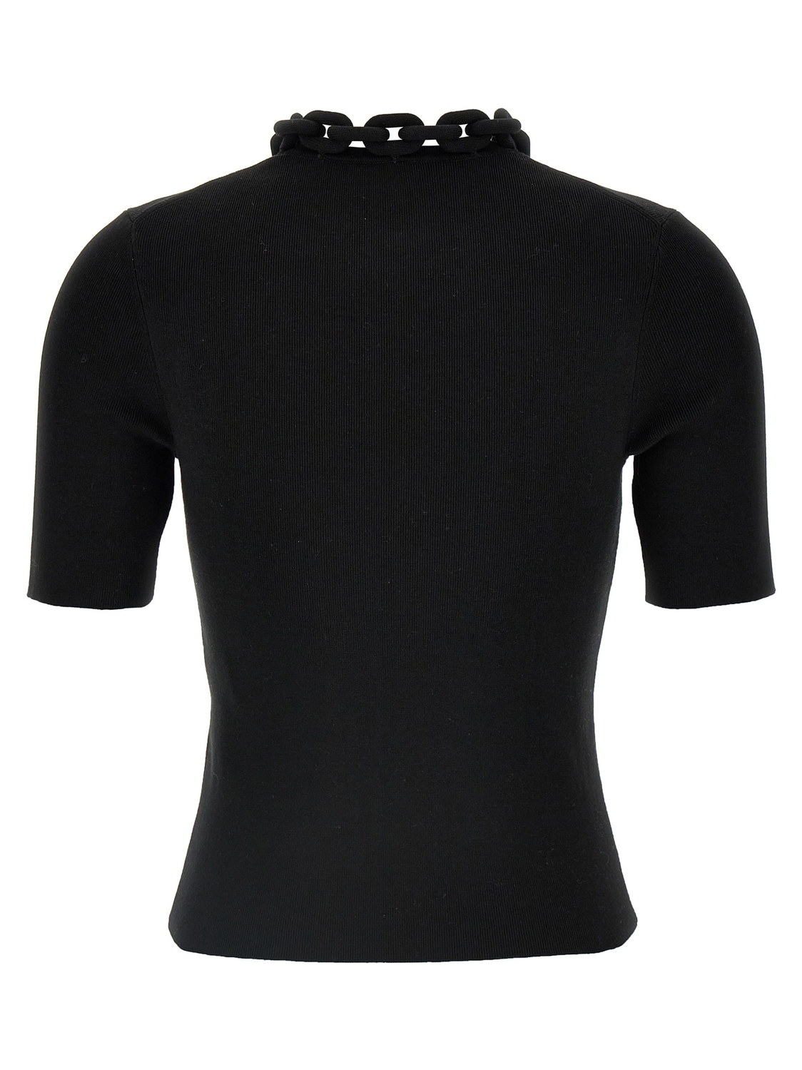 Футболка из микро-ребристого стрейч-хлопка, круглый вырез с металлической и текстильной цепочкой, короткие рукава.