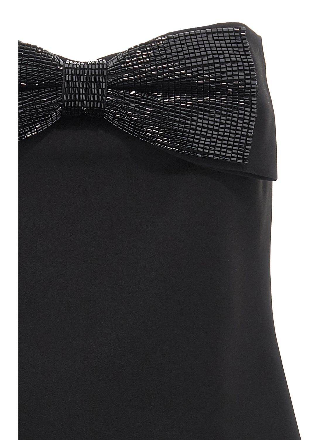 Топ-бандо из черного крепа с аппликацией в виде банта и бусинами спереди, модель с открытыми плечами, застежка на молнию сзади.