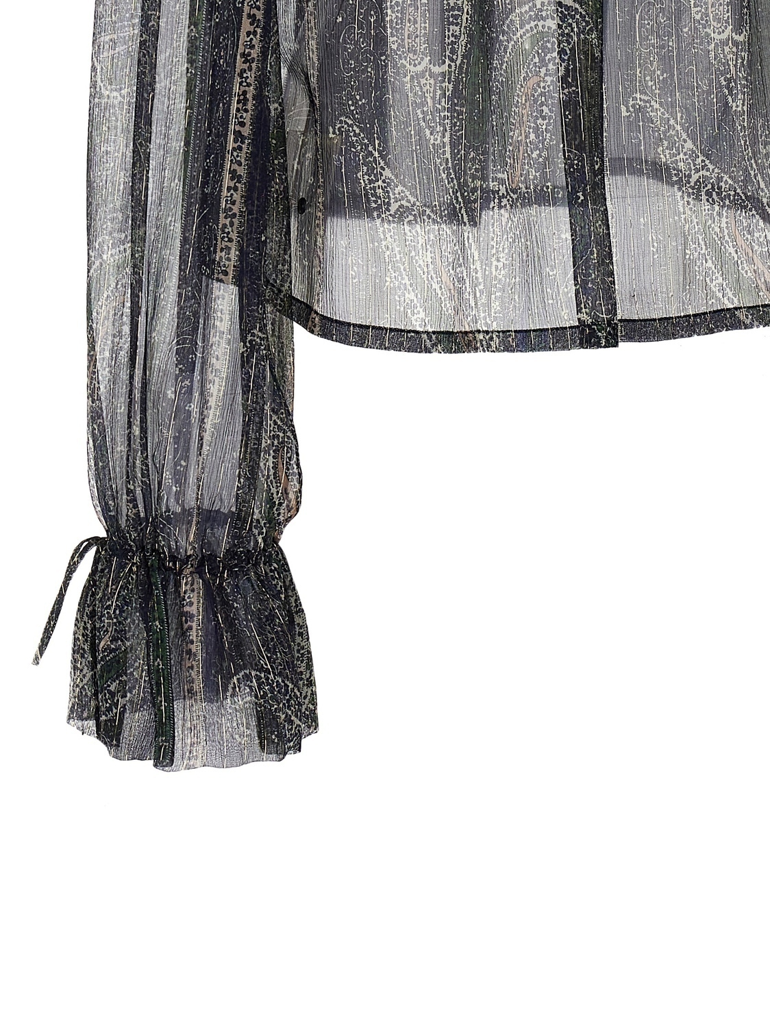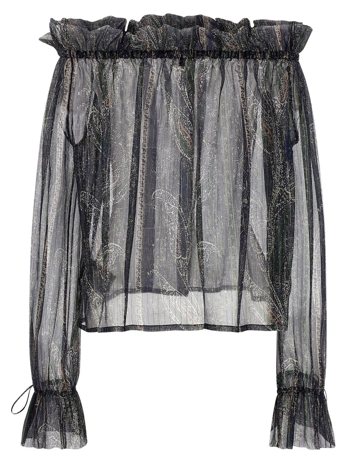 Блуза из шелкового крепона с люрексом с узором «пейсли», модель с открытыми плечами, воротник с оборками, длинные рукава с поэтическими манжетами на завязках.