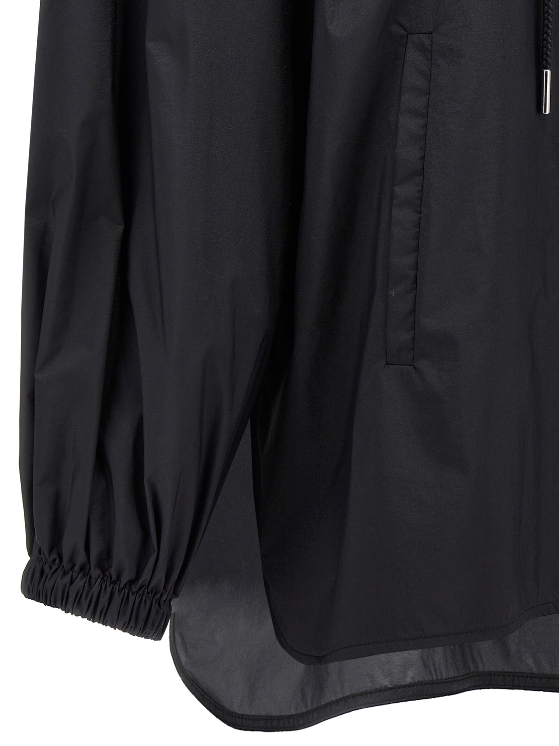 Ветровка из технологичной ткани без подкладки, с рюшей на спинке, съемным воротником-капюшоном, застежкой на молнию спереди, карманами, длинными рукавами со спущенной линией плеч, эластичными манжетами и нашивкой-логотипом в тон, боковыми разрезами и асимметричным подолом.